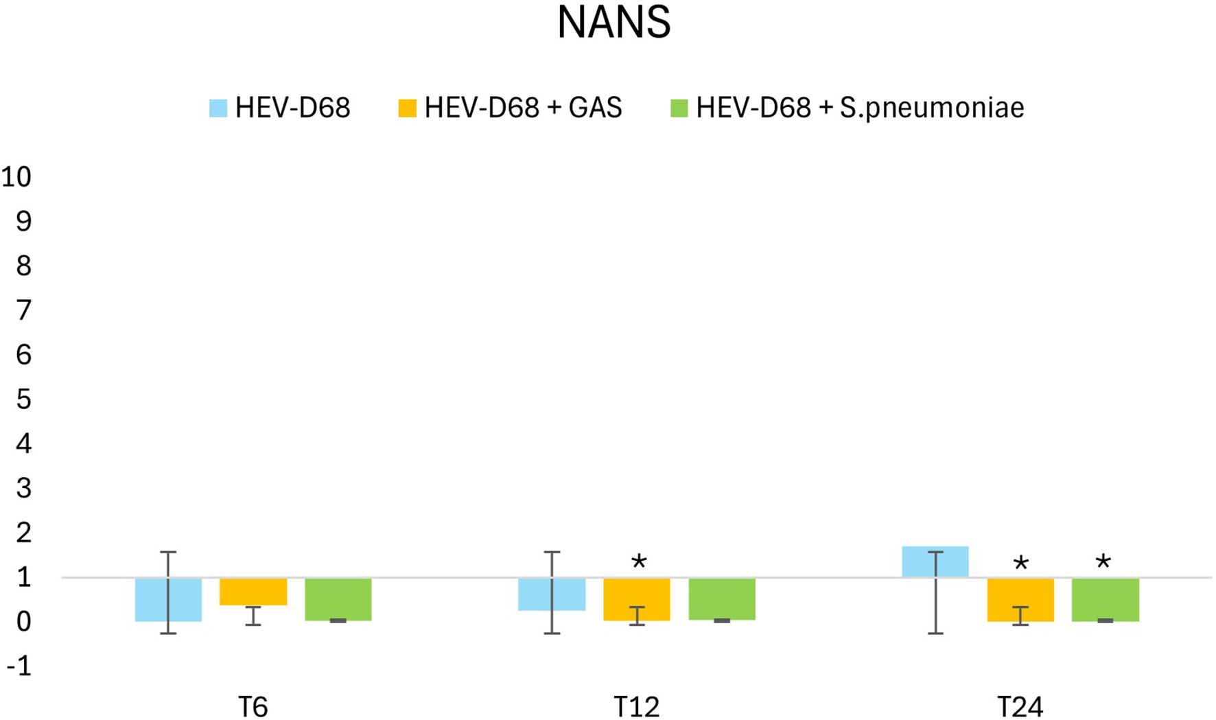 Figure 8 presents the relative gene expression of NANS that shows a downregulation for all the infections. At 6 hours (T6), viral attachment begins, and a small number of viruses are internalized. Between 6 and12 hours, viral uptake increase, initiating biosynthesis. By 24 hours, the expression of NANS rises further in mono-viral infections, reflecting the growing demand for sialic acid synthesis. However, in co-infections with GAS and S. pneumoniae, NANS expression is significantly downregulated, despite the presence of infectious pressure. This suggests that bacterial co-infection may interfere with og supress the host’s biosynthetic response.