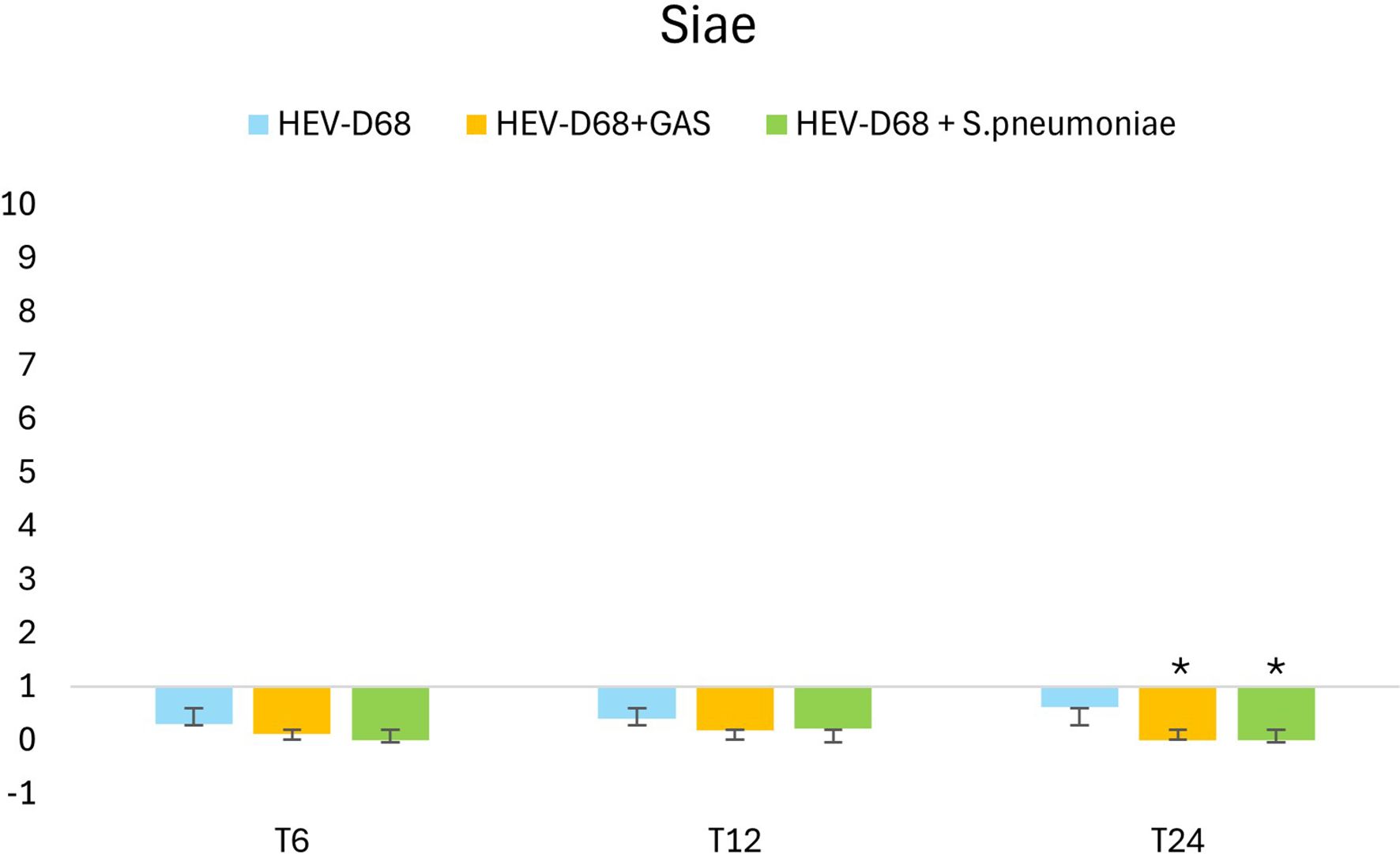 Siae is the enzyme responsible for modifying sialic acid on the cell surface, making it accessible for viral binding. Interestingly, while viruses directly utilize sialic acid as a receptor, bacteria such as S. pneumoniae and GAS cleave the molecule but do not consume the receptor in the same way. In co-infection with S. pneumoniae, Siae expression is significantly downregulated after 6 hours (T6) when the infectious pressure is high. Still the gene expression of Siae in the co-infection is significantly downregulated after 24 hours. These findings highlight the distinct impact of bacterial co-infection on host cell biosynthetic pathways compared to viral infection alone.