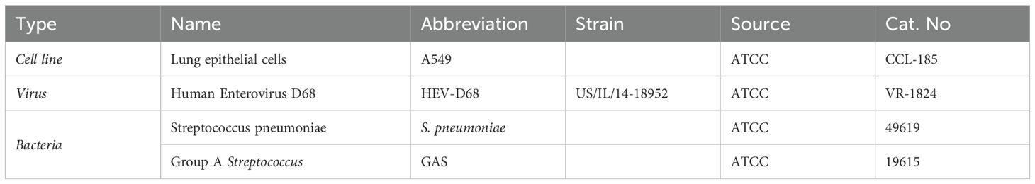Table 2. Experimental conditions and sampling schedule for co-infection with HEV-D68 (VR-1824), Streptococcus pneumonia (ATCC 49619) and GAS (ATCC 19615).