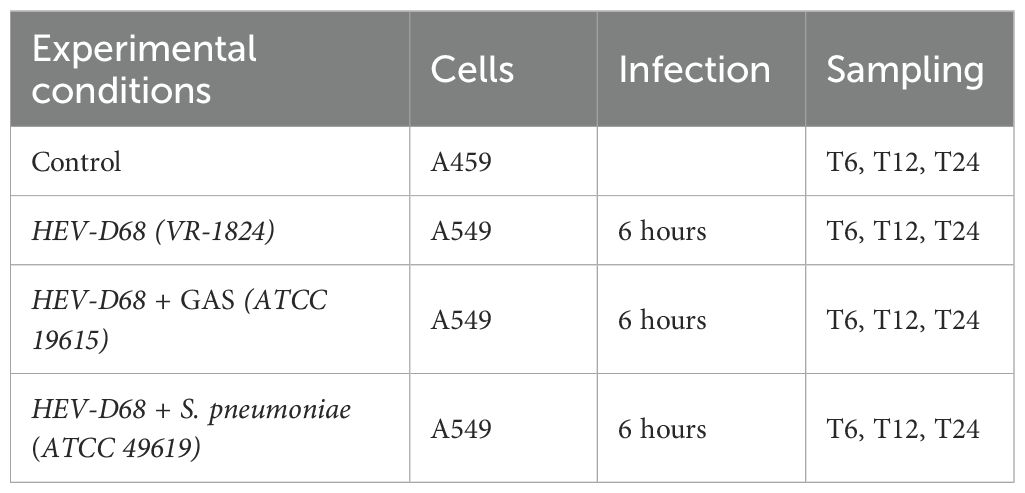 All samples were prepared in biological duplicates. For each time point, one 6-well plate was used per condition. The four experimental conditions included; control (uninfected A549 cells), HEV-D68 (strain US/IL/14-18952, VR-1824), GAS (ATCC 19615) mixed with HEV-D68, and S. pneumoniae (ATCC 49619) mixed with HEV-D68, respectively as listed in Table 2. Prior to infection, the growth medium was removed and cells were washed with 3 ml Dulbecco’s phosphate buffered saline (DPBS; Cat.no RNBH5435, Sigma). Pathogens were added to 3 ml fresh growth medium, with final concentrations of 4xTCID50 for the virus and 108 CFU/ml for bacteria. Plates were incubated for 6 hours at 37°C and 5% CO2.