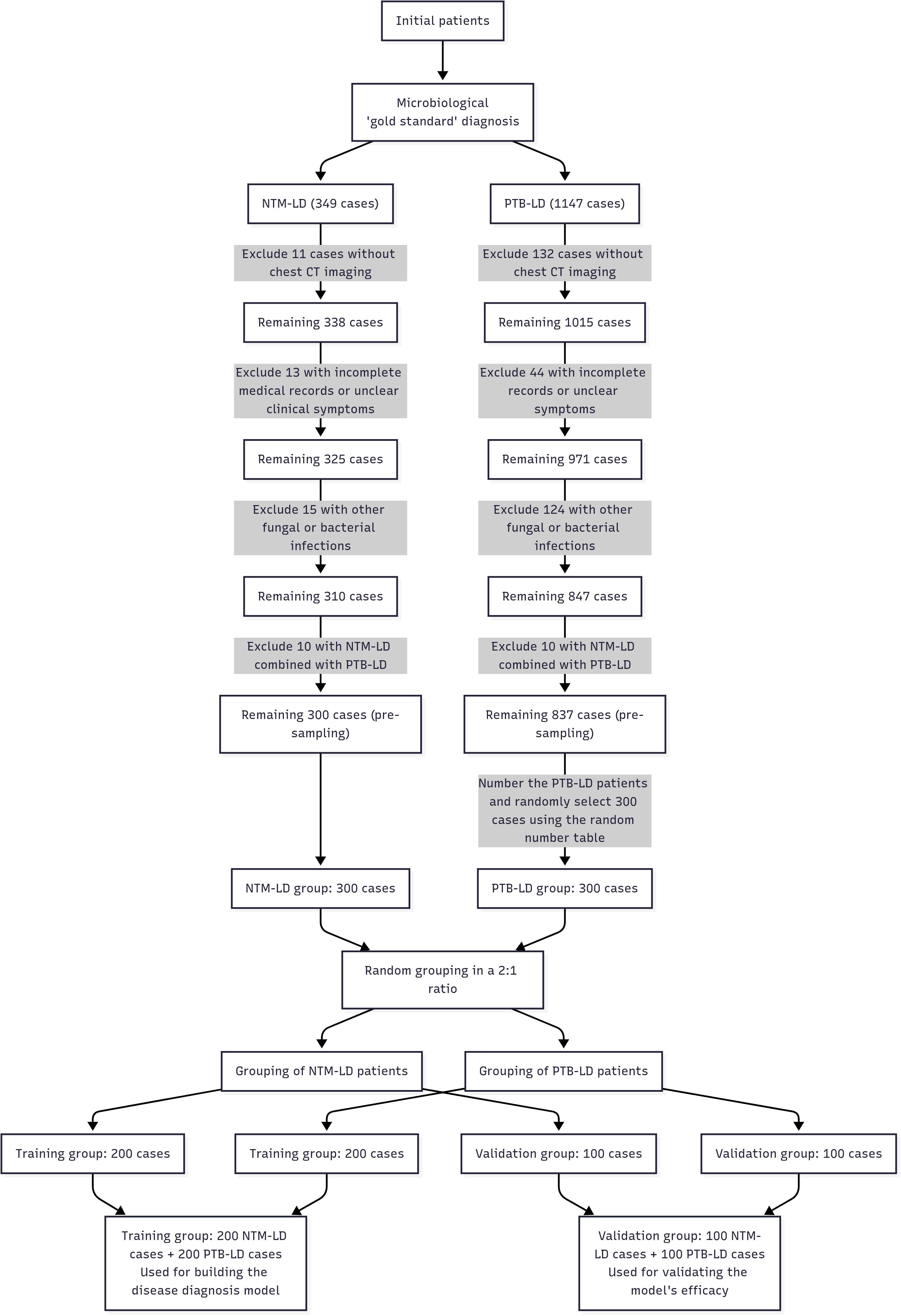 Given the low clinical incidence and relative rarity of NTM-LD, a 1:1 sample size ratio was employed to ensure balanced group sizes and enhance intergroup comparability—particularly to avoid insufficient statistical power due to an excessively small NTM-LD cohort. The NTM-LD group (case group) comprised 300 consecutive inpatients who met all inclusion and exclusion criteria and were admitted between June 2016 and June 2024. The PTB-LD group (control group) comprised 300 patients selected using the random number method from 837 hospitalized patients with PTB-LD who met both the diagnostic criteria and inclusion criteria during the same period. Subsequently, the 300 NTM-LD patients and 300 PTB-LD patients were separately and independently randomized: both cohorts were allocated to the training set and internal validation set at a 2:1 ratio using computer-generated random number tables (random sequences generated via SPSS 26.0 software). Specifically, the 300 NTM-LD patients were randomized into 200 cases in the training set and 100 cases in the internal validation set; similarly, the 300 PTB-LD patients were randomized into 200 cases in the training set and 100 cases in the internal validation set. The process of patient grouping and data collection is shown in Figure 1.