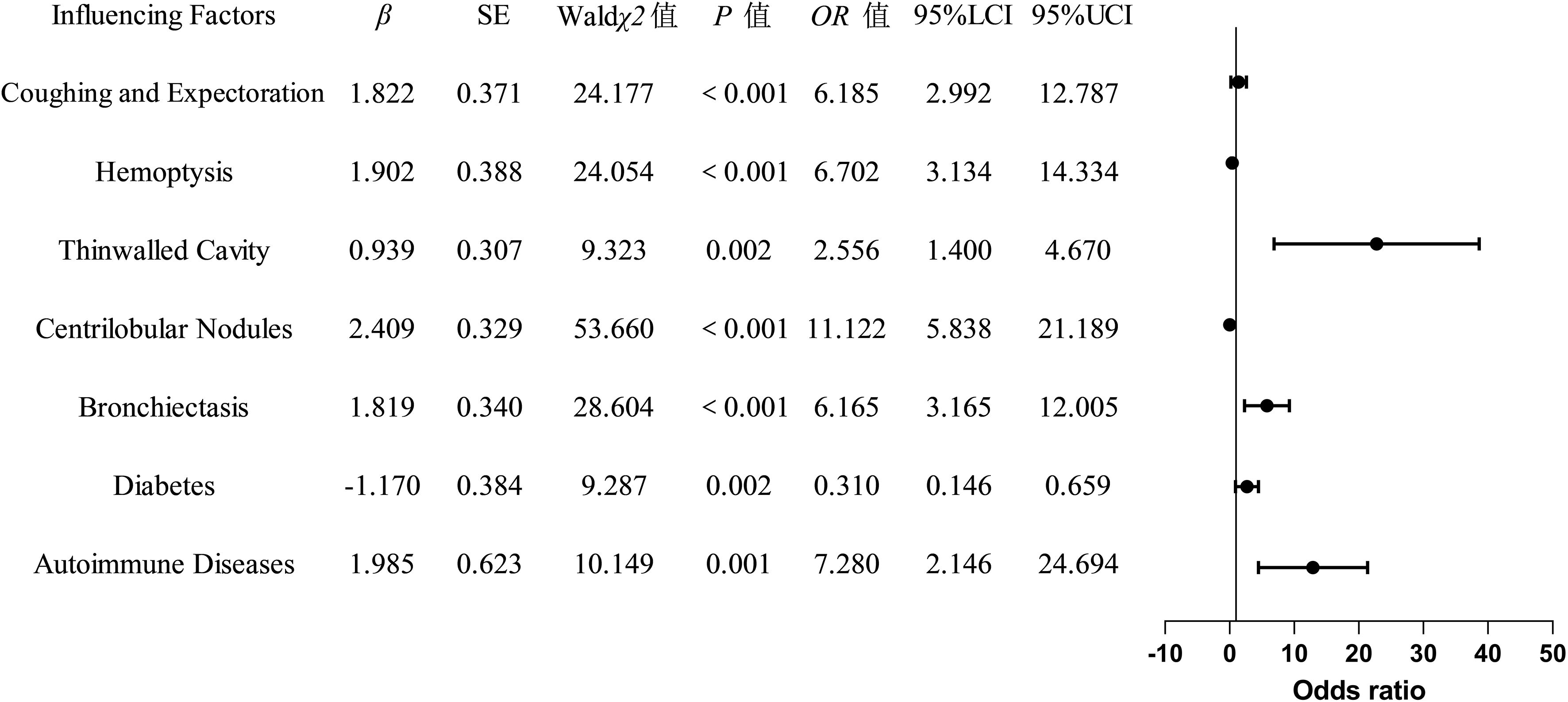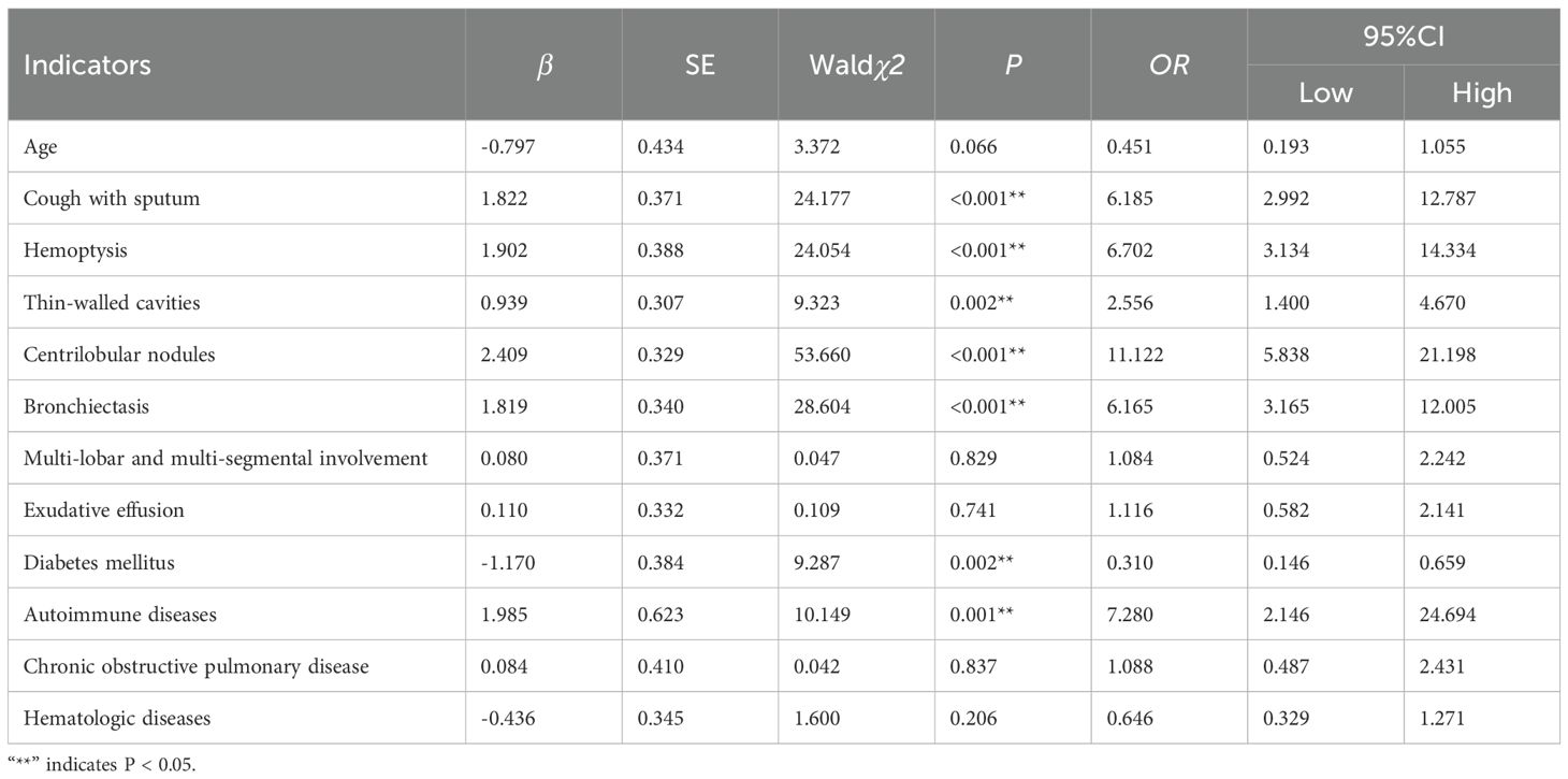 Variables for univariate analysis were selected based on expert consensus and clinical relevance. The study adopted a relatively lenient significance threshold (P<0.1) to allow inclusion of variables demonstrating “marginally significant” features in the multivariate analysis. Results revealed statistically significant differences between the two groups in the following 12 parameters (all P<0.1): age, cough with sputum production, hemoptysis, thin-walled cavities, centrilobular nodules, bronchiectasis, multi-lobar and multi-segmental involvement, exudative lesions, diabetes mellitus, autoimmune diseases, chronic obstructive pulmonary disease (COPD), and hematologic diseases. Conversely, no significant intergroup differences were observed in fever, wheezing, chest pain, disseminated lesions, fibrotic streaks, mediastinal lymph node enlargement, malignant tumors, interstitial lung disease, AIDS, pleural thickening, or hypoalbuminemia (all P > 0.1). Detailed data are presented in Table 2.