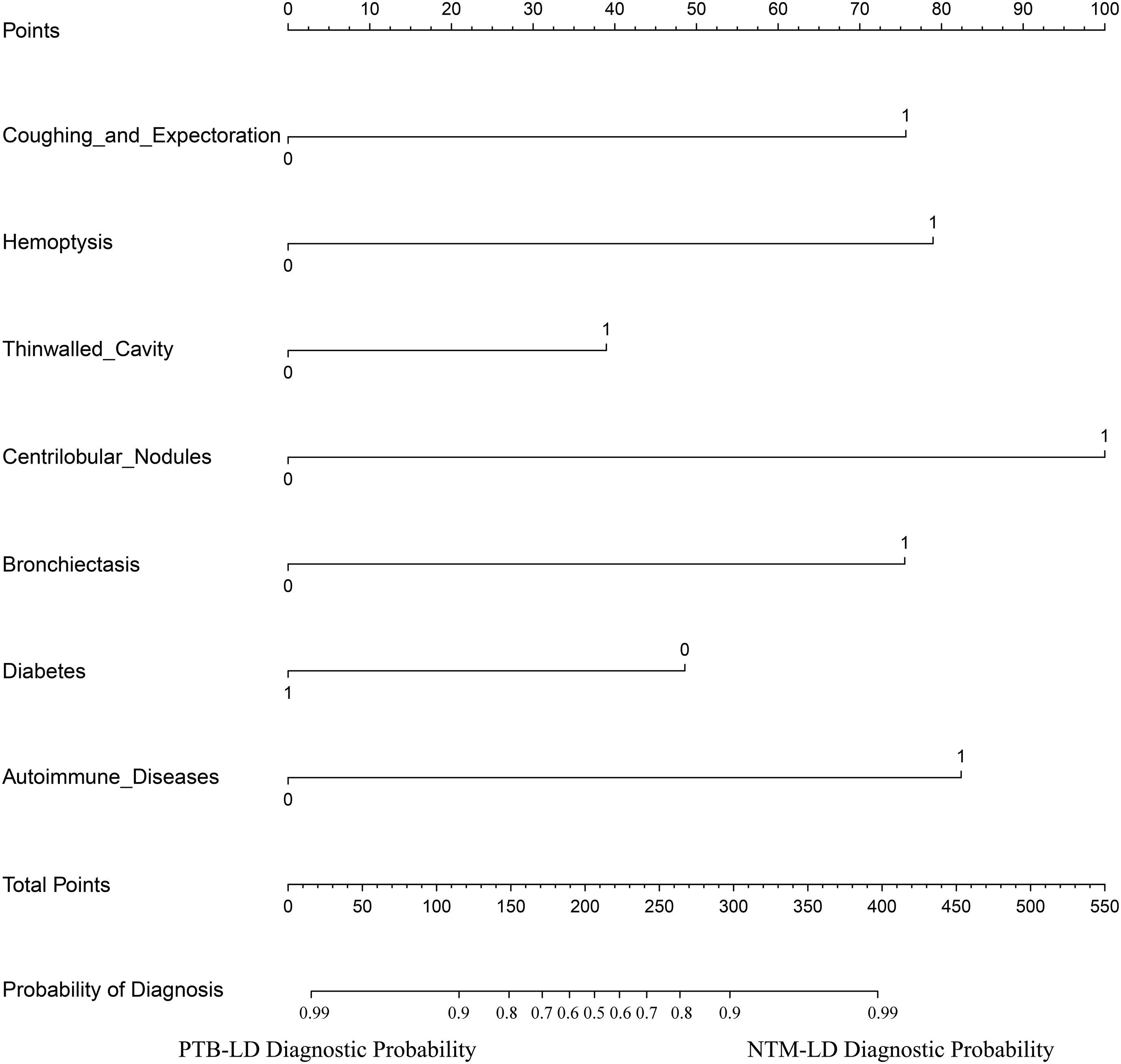 Conclusions: The model constructed based on patients’ CT imaging, basic clinical data, and symptomatic signs demonstrates commendable performance in the differential diagnosis of NTM-LD and PTB-LD, offering a convenient and practical auxiliary tool for clinical practice.