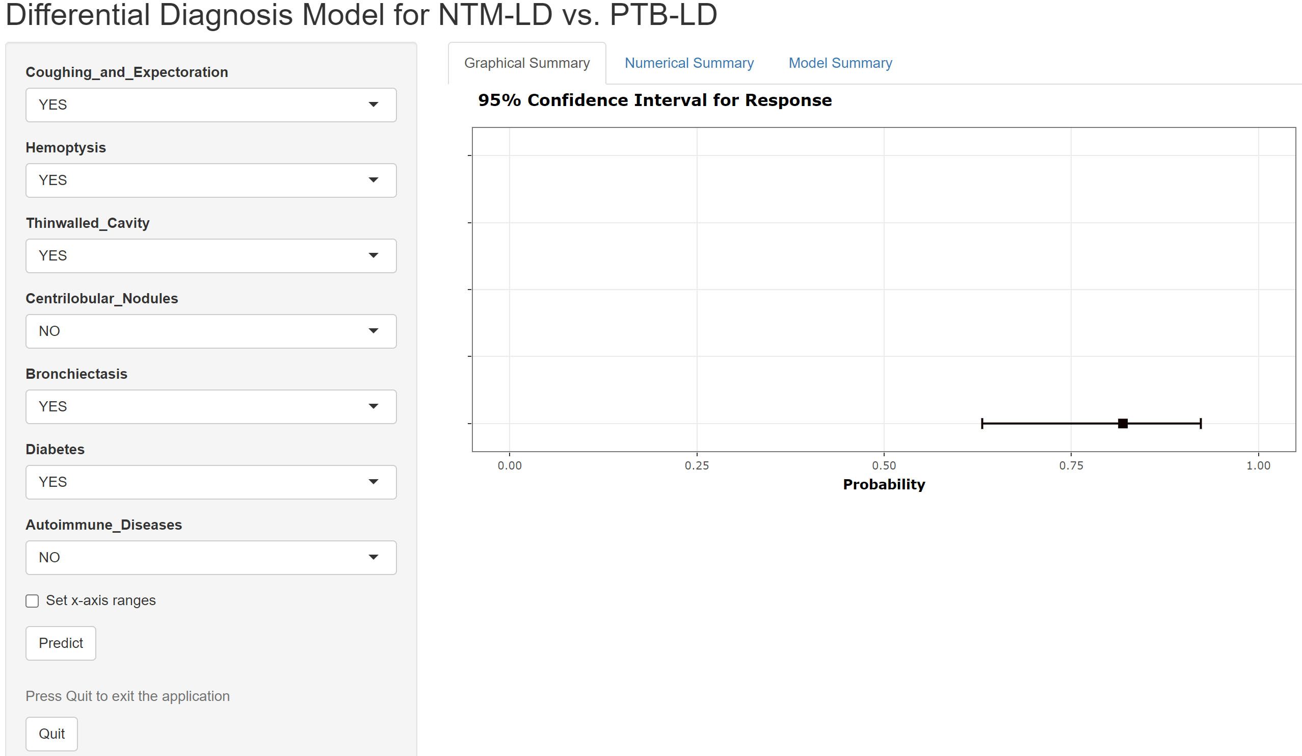 The constructed equation was visualized using the ‘rms package’ in R software to generate a nomogram prediction model for differentiating NTM-LD and PTB-LD (Figure 3). Based on the patient’s clinical manifestations, including cough with sputum, hemoptysis, thin-walled cavities, centrilobular nodules, bronchiectasis, Diabetes mellitus, and autoimmune diseases, values are assigned to each variable. By creating vertical lines on the nomogram, corresponding scores can be identified on the scoring axis for each parameter. These scores are summed to calculate the total score. Finally, the total score is projected onto the risk axis to estimate the probability of NTM-LD occurrence for that patient. For example, a patient presenting with cough and sputum receives a score of 75, while the absence of this symptom yields 0 points. Patients with hemoptysis are assigned 80 points, whereas those without receive 0. The presence of thin-walled cavities adds 40 points, and their absence contributes 0. Centrilobular nodules are scored 100 if present and 0 if absent. Bronchiectasis corresponds to 75 points when present and 0 when absent. Notably, patients without diabetes are assigned 50 points, while those with diabetes receive 0. Conversely, patients with autoimmune diseases are scored 80 points, and those without are assigned 0. These individual scores are summed to calculate the total score. The total score is then projected onto the risk axis of the nomogram to determine the patient’s probability of developing NTM-LD. To facilitate clinical use, we further developed a web-based score calculator based on this nomogram prediction model (accessible at https://dynamic-diagram.shinyapps.io/DynNomapp/), Figure 4.