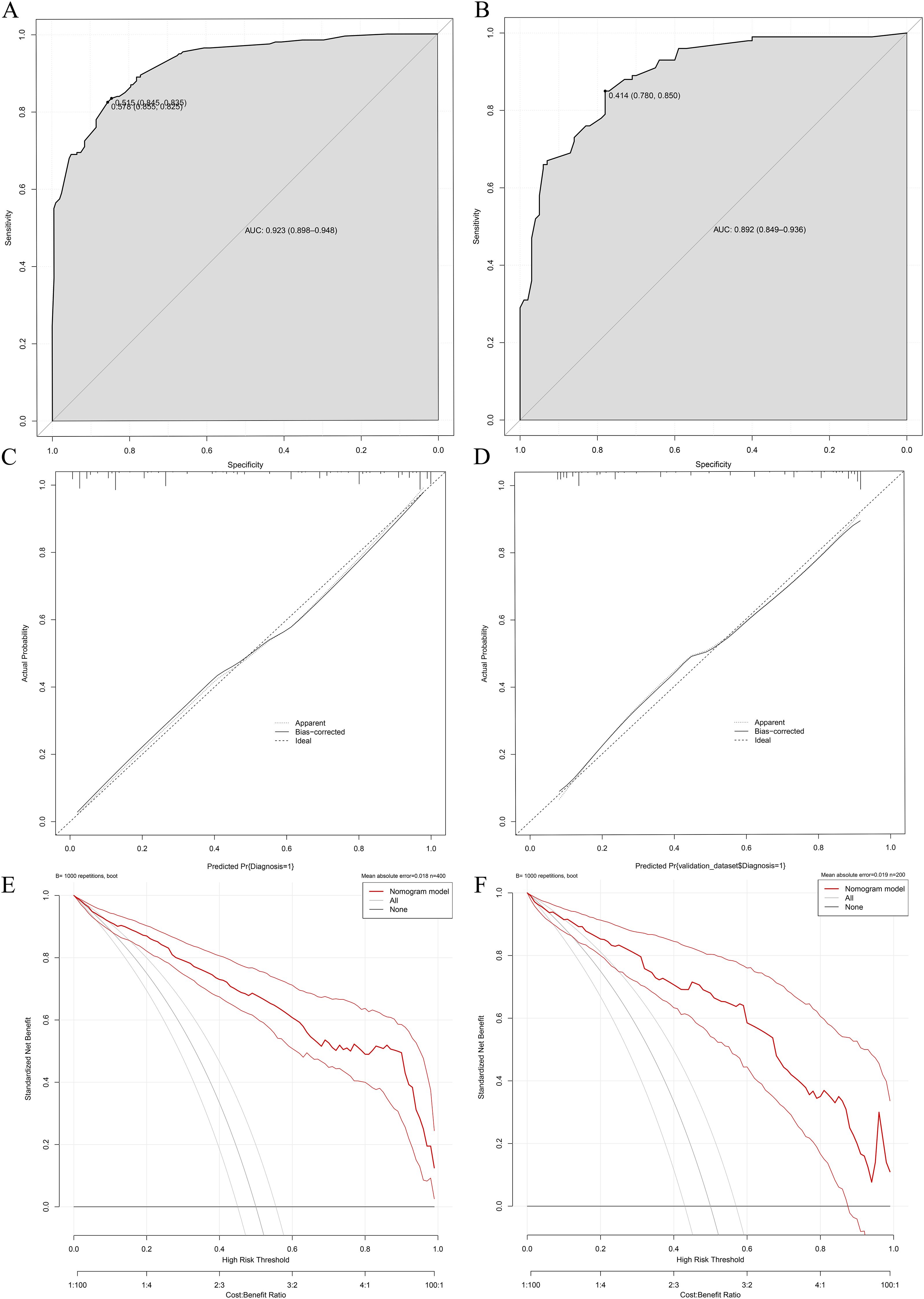 The validation results demonstrated consistent diagnostic performance of the nomogram across both the training and internal validation cohorts. In the training cohort, the model achieved an area under the receiver operating characteristic (ROC) curve (AUC) of 0.923 (95% confidence interval [CI]: 0.898-0.948), with a specificity of 85.5% and sensitivity of 82.5% (Figure 5A), indicating superior differentiation capability between NTM-LD and PTB-LD. Furthermore, calibration curve analysis revealed close agreement between predicted probabilities and observed outcomes confirming excellent calibration accuracy (Figure 5C). To further evaluate the model’s generalizability, an internal validation cohort comprising 100 NTM-LD patients and 100 PTB-LD patients was included. The model demonstrated correct diagnosis rates of 88.0% (88/100) for NTM-LD and 75.0% (75/100) for PTB-LD, achieving an overall diagnostic accuracy of 81.5% (163/200). In the validation cohort, the AUC reached 0.892 (95% CI: 0.792-0.900) with specificity of 78% and sensitivity of 85% (Figure 5B), indicating clinically generalizable discriminative performance. The Hosmer-Leme show test revealed no significant deviation between predicted and observed values (χ²=6.32, P=0.176), while the calibration curve exhibited 94.7% concordance with the ideal curve (Figure 5D), further validating calibration robustness. To quantify clinical utility, decision curve analysis (DCA) was employed to assess model net benefit. Across both training and validation sets, the model demonstrated significant clinical net benefit compared to “all- NTM-LD” or “all-PTB-LD” strategies when threshold probabilities across a wide range (Figures 5E, F), suggesting its applicability across diverse clinical decision-making scenarios.