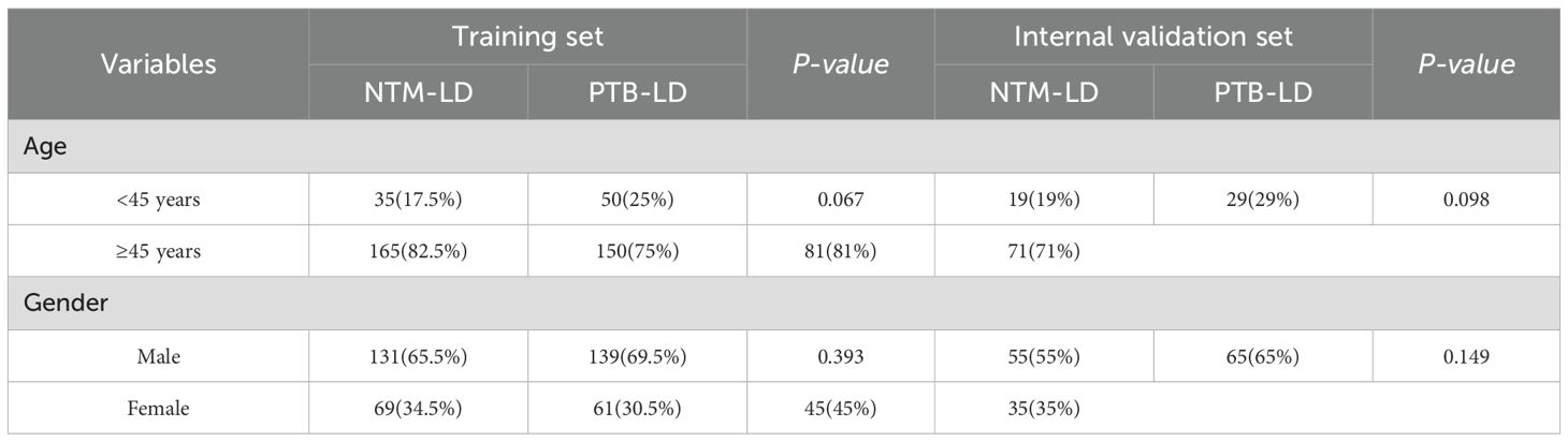 This study included a total of 300 NTM-LD patients and 300 PTB-LD patients. They were randomly divided into a training set (NTM-LD=200, PTB-LD=200) and an internal validation set (NTM-LD=100, PTB-LD=100) at a 2:1 ratio. There were no statistically significant differences in age and gender distribution between the two groups (P > 0.05). The demographic characteristics of the training set and internal validation set are shown in Table 1.