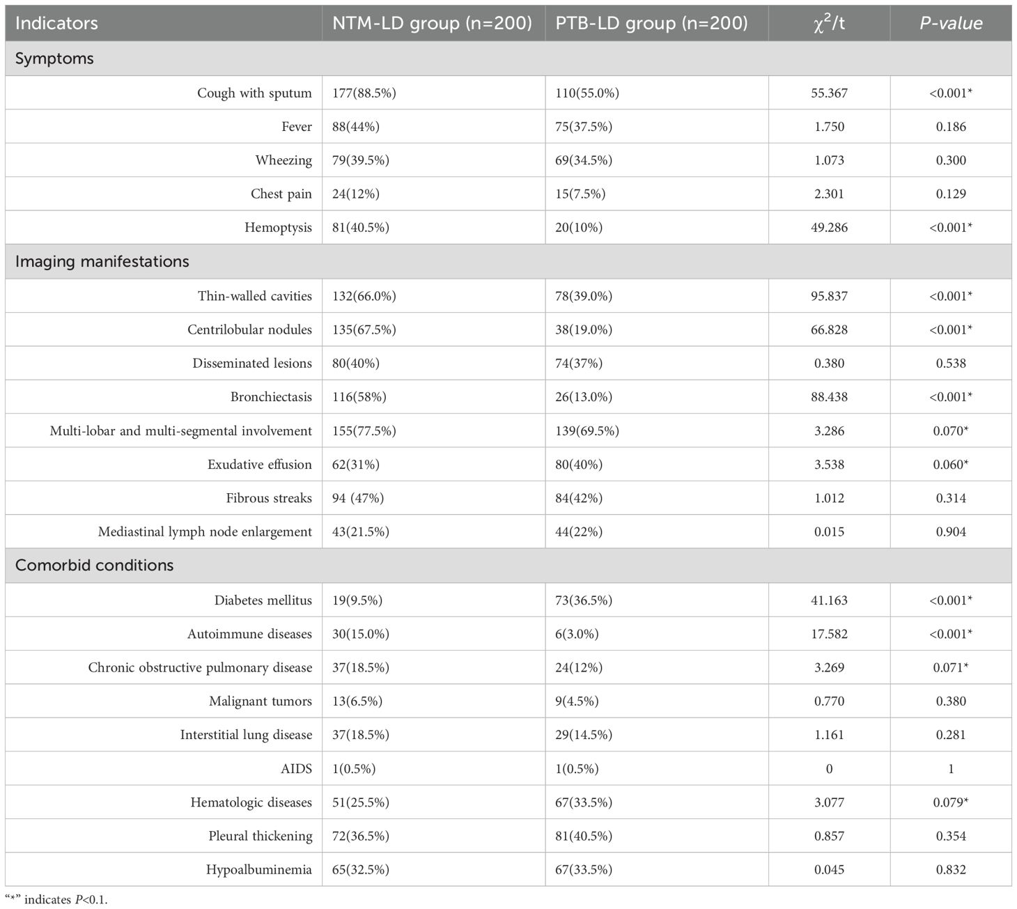 A retrospective analysis was conducted on the basic clinical data, symptoms, signs, and imaging findings of patients with Non-tuberculous Mycobacterial Lung Disease (NTM-LD) and Pulmonary Tuberculosis Lung Disease (PTB-LD) admitted to the Department of Tuberculosis and Tuberculosis Surgery at Tianjin Haihe Hospital. The diagnosis of NTM-LD was based on the Chinese Guideline for the Diagnosis and Treatment of Non-tuberculous Mycobacterial Disease (2020 Edition) (C.M.A. Society of Tuberculosis, 2020), while PTB-LD was diagnosed in accordance with the Official Clinical Practice Guidelines jointly issued by the American Thoracic Society (ATS), Infectious Diseases Society of America (IDSA), and Centers for Disease Control and Prevention (CDC) (Hauk, 2018).microbiological diagnosis served as the “gold standard” for confirmation.
