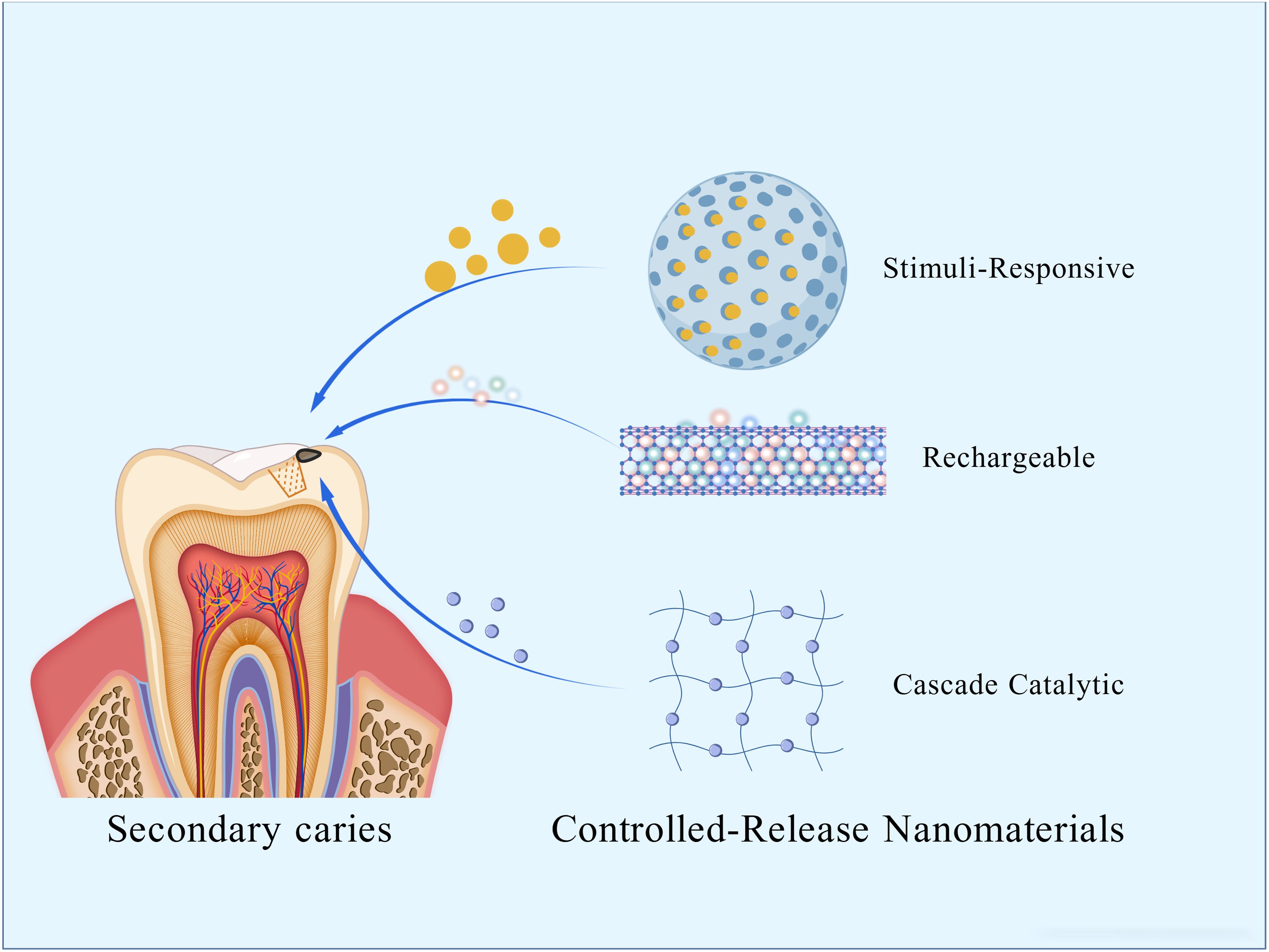 This paper systematically reviews the latest mechanistic advances in controlled-release nanomaterials for preventing secondary caries. Stimulus-responsive systems have evolved from single pH triggers to multi-stimulus synergistic activation, rechargeable nanocarriers have graduated from one-off ion reservoirs to “stimulus–response–re-supply” cycles, and cascade nanoplates now seamlessly integrate antibacterial, acid-neutralizing, and remineralizing functions for precise modulation of the cariogenic microenvironment.