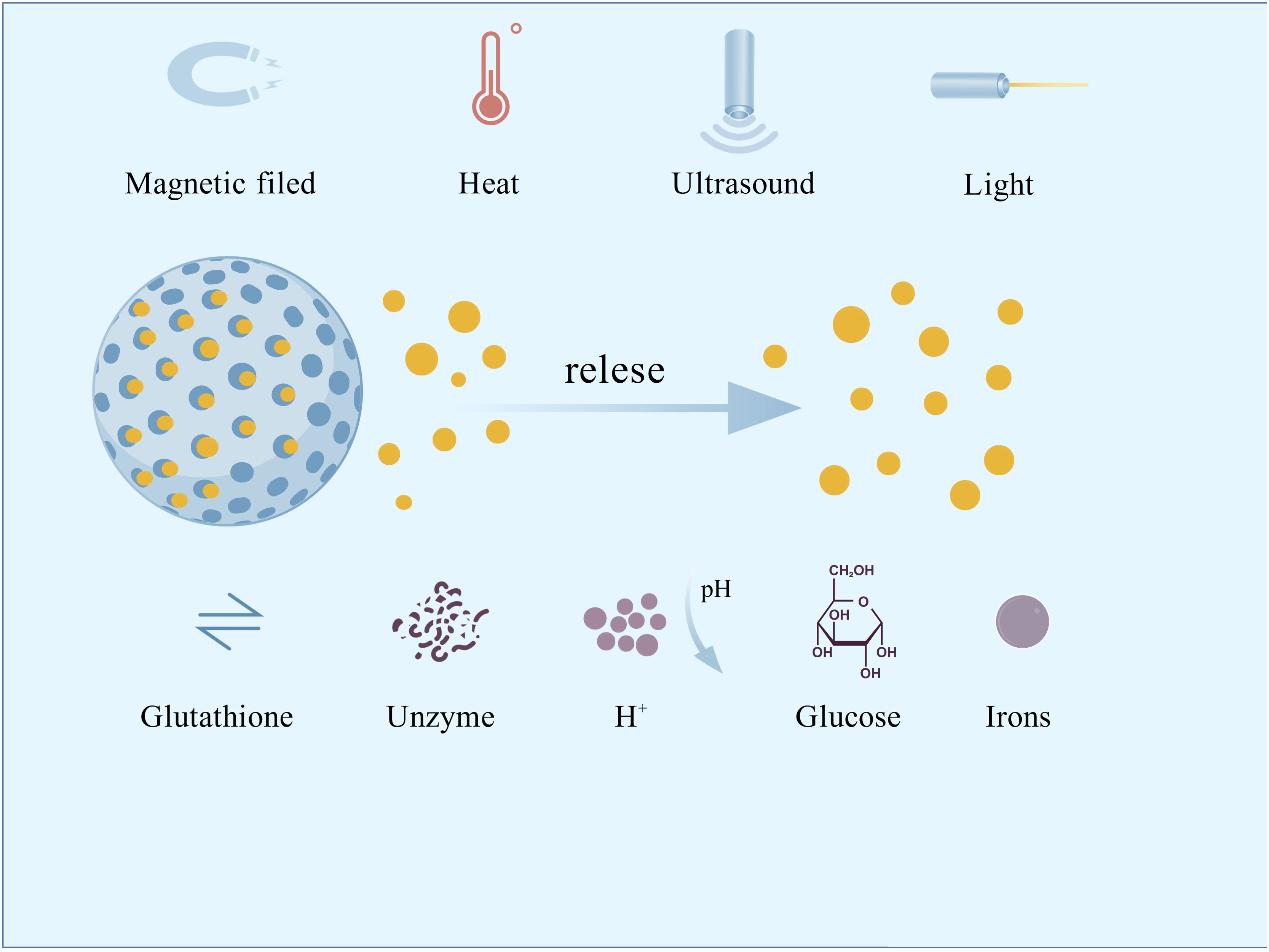 Additionally, concerns arose regarding the accumulation of metal nanoparticles in the body, their potential to induce inflammation, and the risk of breaching the blood-brain barrier (Wang et al., 2023; Yang et al., 2024). Controlled-release nano-antimicrobial materials, which can precisely respond to changes in the oral microenvironment to release antimicrobial agents, have emerged as a highly promising strategy to address this challenge. Common stimulants include exogenous magnetic fields, ultrasound, light, temperature, endogenous glutathione, enzymes, acids, glucose, ions, etc. (Figure 1). Light, temperature, and acid stimulants are commonly used to develop oral nanomedicines. Research on pH responsiveness to the special environment created by microbial acid production is the most prevalent.