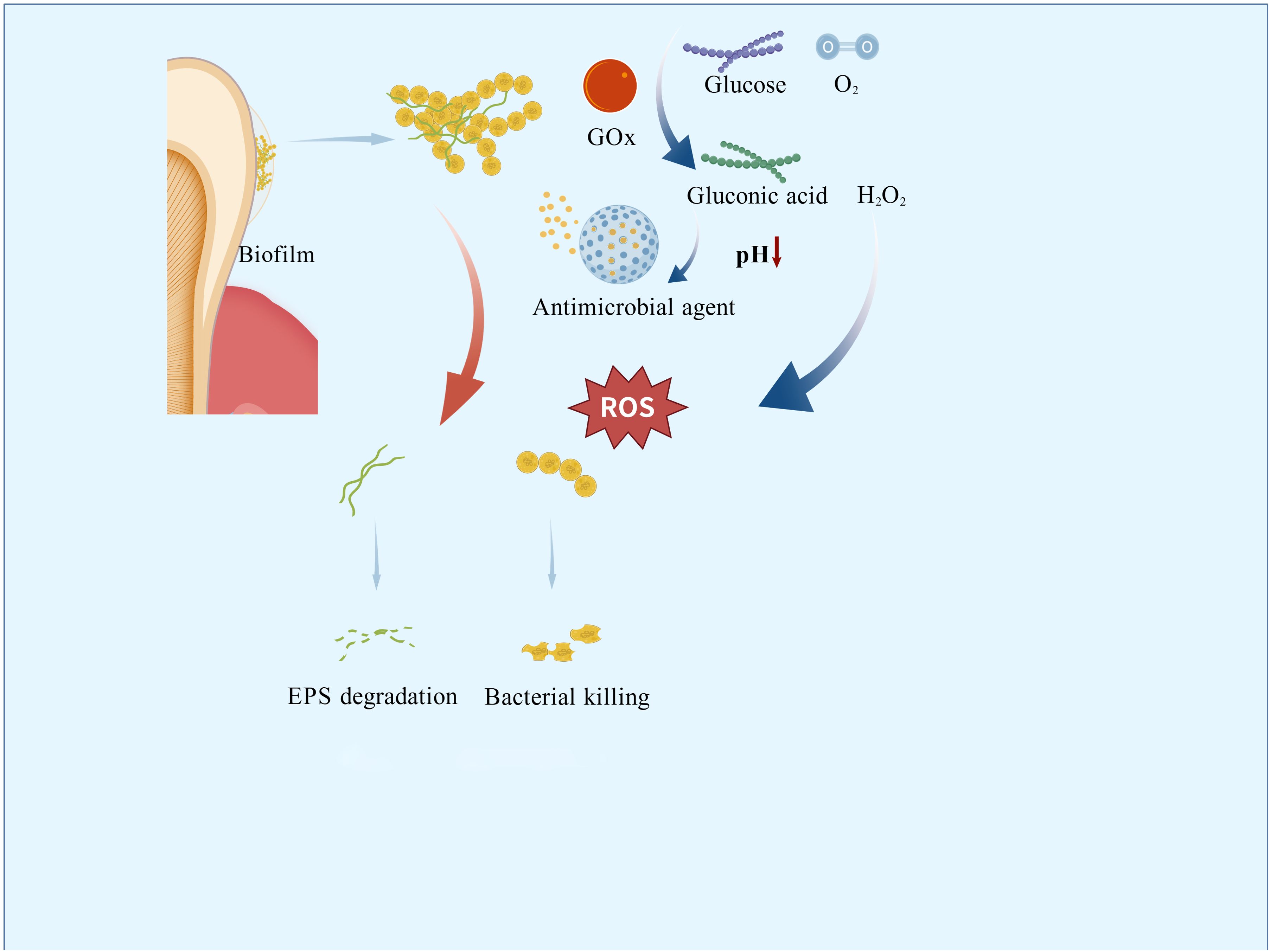 GOx exhibits catalytic properties and bioactivities uniquely suited to the cariogenic microenvironment: it oxidizes glucose and oxygen into gluconic acid and hydrogen peroxide (Dubey et al., 2017). This reaction directly depletes free glucose, competing with S. mutans for metabolic substrates and suppressing bacterial growth and acid production (Senol et al., 2007; Yuan et al., 2015). The in situ-generated hydrogen peroxide reduces glucosyltransferase activity, diminishing viscous glucan synthesis and disrupting biofilm formation mechanisms (Zhang et al., 2021). Concurrently, gluconic acid production triggers pH-responsive drug release (Wang et al., 2022). GOx is not used in isolation. It is integrated into nanocomposites that incorporate additional targeting strategies (such as magnetic guidance, pH-responsive release, or photothermal activation) which enhance spatial precision and biological specificity. GOx does not target specific bacterial species through molecular recognition, but rather functionally discriminates against cariogenic pathogens. These targeted mechanisms establish a novel paradigm for constructing multimodal antimicrobial systems.