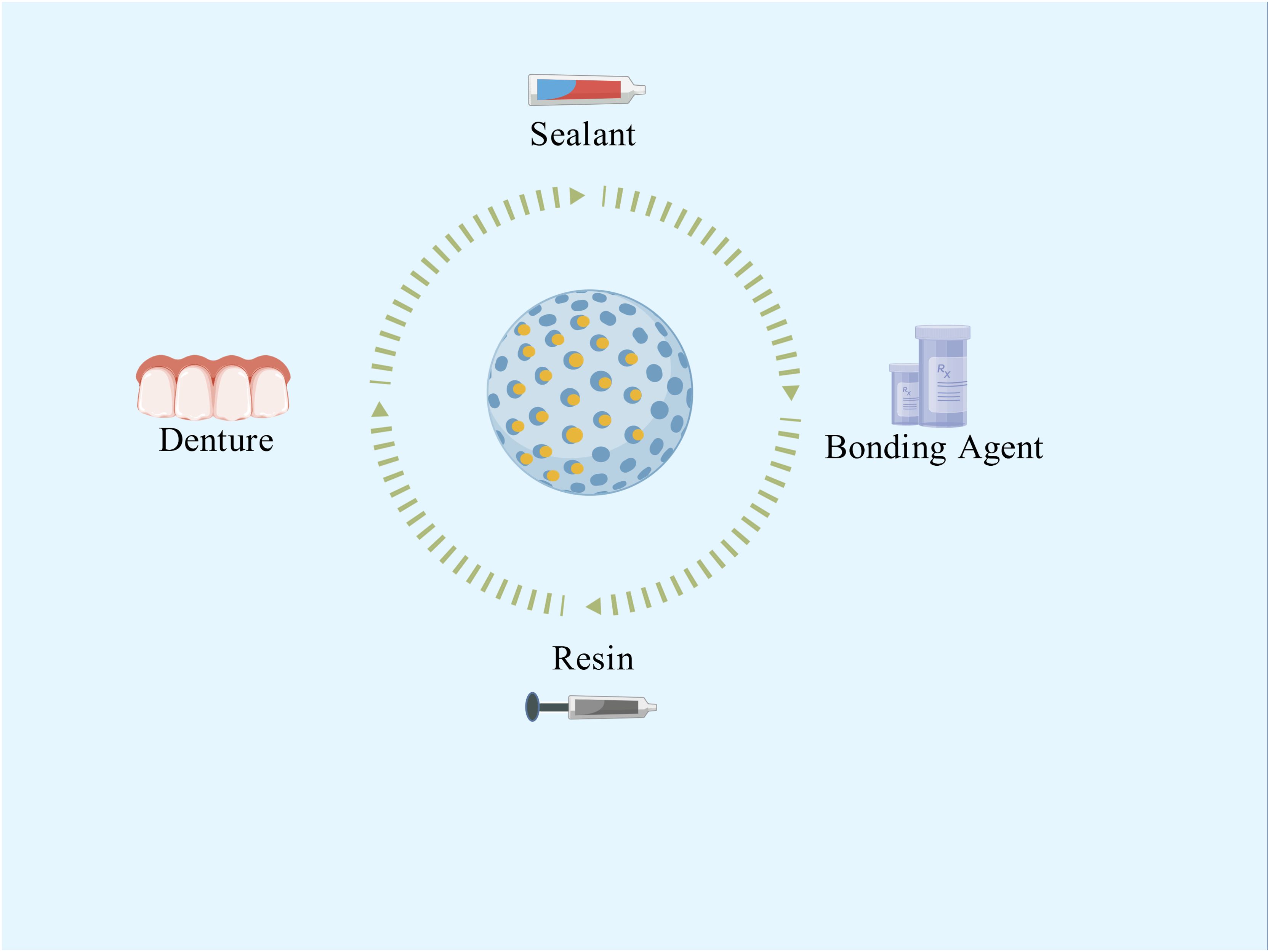 In addition to the two aforementioned oral-specific environmental resistance factors, the clinical translation of nanomaterials currently faces several challenges:(1) the long-term biosafety, biocompatibility, and functional durability of these nanomaterials within the oral cavity require rigorous assessment in live animal models and, ultimately, clinical trials (Sajithkumar et al., 2025). Many studies discussed in this article are primarily in vitro. Not only in the dental field, one of the biggest current challenges for nanomaterials is the lack of long-term in vivo experiments. While a few studies have employed rodent caries models to show efficacy in reducing lesion severity, these are often short-term and lack evaluation of critical endpoints; (2) the regulatory landscape for nano-enabled medical products remains fragmented. Harmonized characterization standards and quality-control guidelines are urgently required. Critical parameters—including particle-size distribution, surface charge, and degradation products—must be quantified through validated, standardized assays to guarantee batch-to-batch consistency and clinical reproducibility (Rodríguez-Gómez et al., 2025). (3) Since some dental materials need to meet aesthetic requirements, the coloration issue of certain metal nanoparticles also cannot be ignored. Despite these challenges, the unique properties of controlled-release nano-antimicrobial materials have led to their exploration in a wide range of dental applications. These applications aim to leverage their sustained and targeted antibacterial action to improve the longevity and success of various dental treatments and restorative procedures (Figure 4).