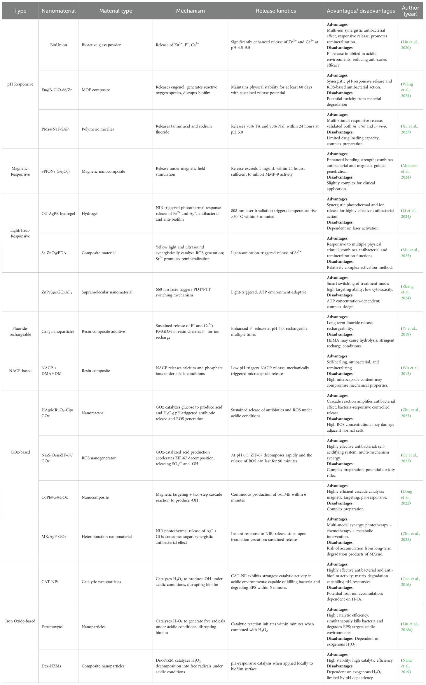 Early efforts to extend the service life of dental composites centered on enhancing their mechanical properties and minimizing polymerization shrinkage (Zhang et al., 2015; Balhaddad et al., 2021). Advances in nanotechnology have spurred interest in multifunctional composites, marking a pivotal shift from passive to active strategies in preventing secondary caries. Antimicrobial composites reduce bacterial adhesion via antimicrobial release or contact-killing, preventing biofilm formation (Jiao et al., 2019; Xue et al., 2020). Composites designed for remineralization can provide ion sources: calcium and phosphate to compensate for structural damage caused by demineralization in early-stage caries (Besinis et al., 2014). Traditional antimicrobial agents or remineralization ions are often released linearly or uncontrolled, resulting in short release durations and uncontrollable release quantities (Sivakumar et al., 2014). However, with the continuous development of nanotechnology, this issue has been effectively addressed, enabling precise control over the release of antimicrobial agents and remineralization ions (Rostami et al., 2025). By carefully designing the structure of nanomaterials to respond to specific stimuli, targeted release can be achieved (Wang et al., 2024). Rechargeable nanomaterials allow for the repeated release of bioactive agents, while sophisticated cascade nanoreactors enable a synergistic, multi-step process of antibacterial action and remineralization within the caries microenvironment. Crucially, nanoparticles preserve the mechanical strength of restorative materials while introducing new functionalities (Amin et al., 2025).