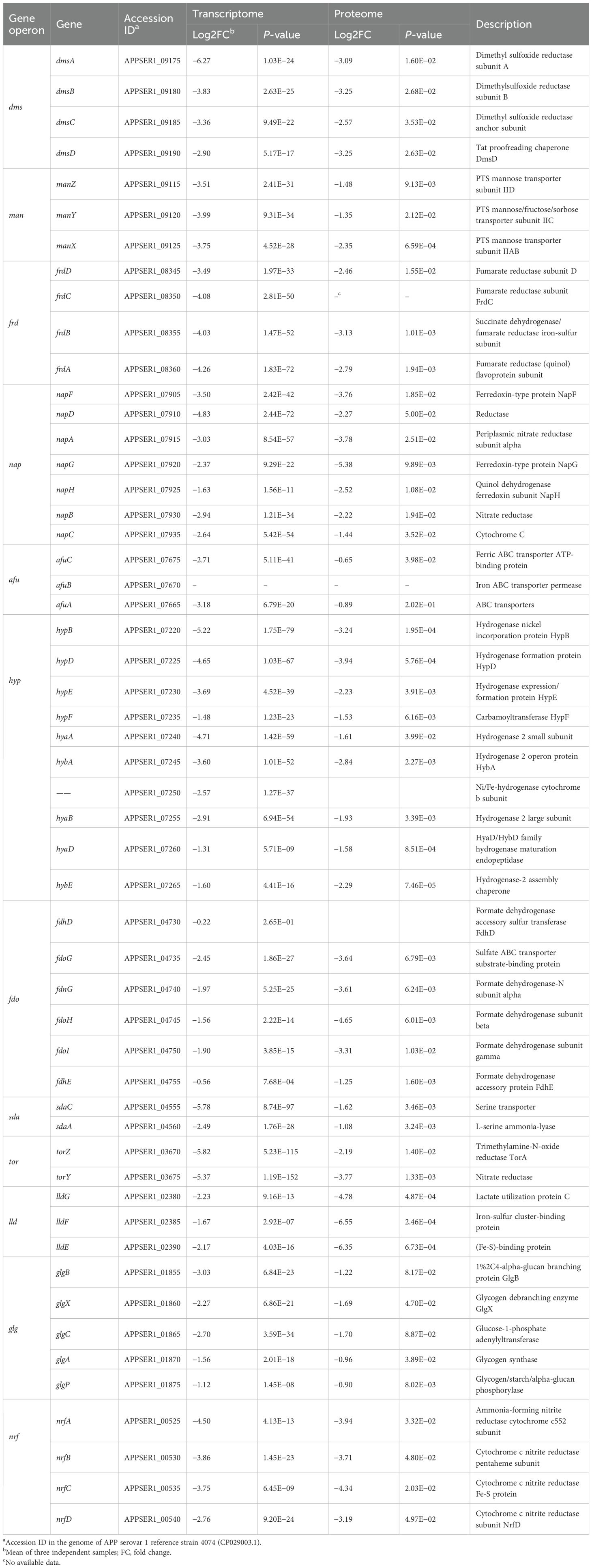 The anaerobic respiratory chains were coordinately downregulated (Table 1). The dimethyl sulfoxide reductase (dms operon), fumarate reductase (frd operon), periplasmic nitrate reductase nap locus, the TMAO reductase (tor operon), and cytochrome C nitrite reductase (nrf operon) were significantly downregulated (Baez et al., 2022). APP likely downregulated iron-dependent anaerobic respiration to conserve iron (essential for Fe-S clusters and heme cofactors) and reduce reliance on this energy-generating pathway (Lill and Freibert, 2020). In addition, APP inhibited hydrogen metabolism. The genes involved in [Ni-Fe]-hydrogenase maturation (hyp operon) and hydrogenase structural subunits (hya/hyb) were strongly downregulated, potentially eliminating an alternative energy source in response to iron limitation (Rios-Delgado et al., 2025).