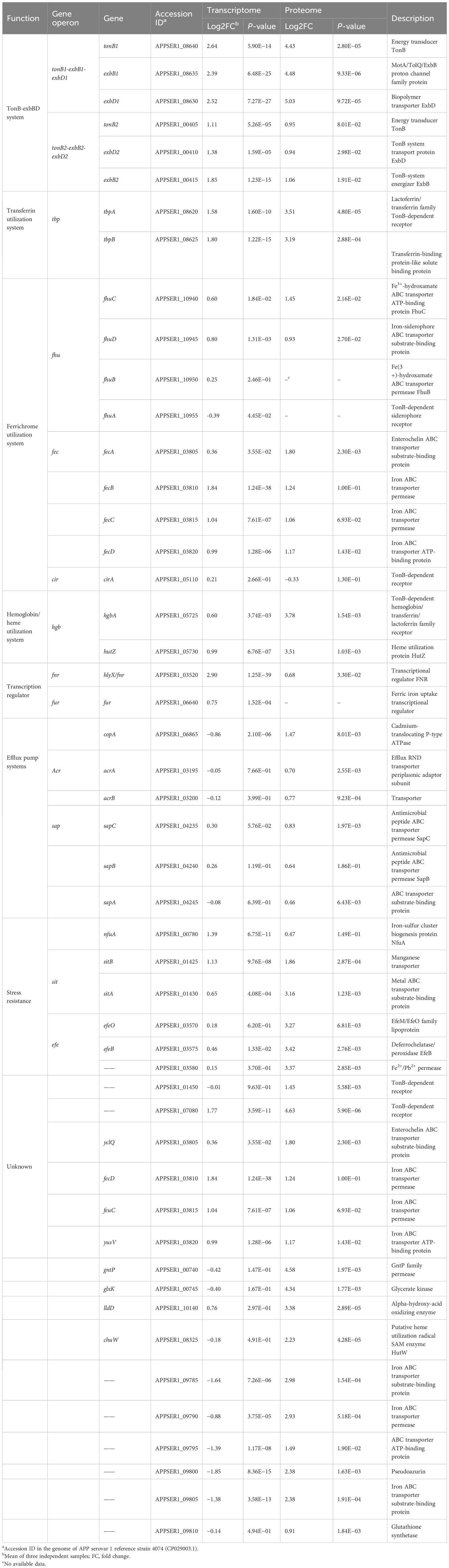 The iron-responsive transcriptional regulators HlyX (FNR) and Fur were involved in iron homeostasis in APP (Jacobsen et al., 2005; Buettner et al., 2009). The hlyX gene (APPSER1_03520) was significantly upregulated at both the transcript and protein levels, likely coordinating the repression of iron-consuming processes (e.g., anaerobic metabolism) and potentially synergizing with other iron starvation responses (Buettner et al., 2009). Fur is recognized as a key positive regulator of APP virulence (Jacobsen et al., 2005), acting primarily as a repressor of virulence genes under iron-replete conditions, and this repression is alleviated during iron starvation (Stoffel and Drakesmith, 2024). In this study, no significant difference in fur expression was observed, suggesting that iron deficiency may directly relieve fur-mediated repression without necessitating increased Fur protein abundance.