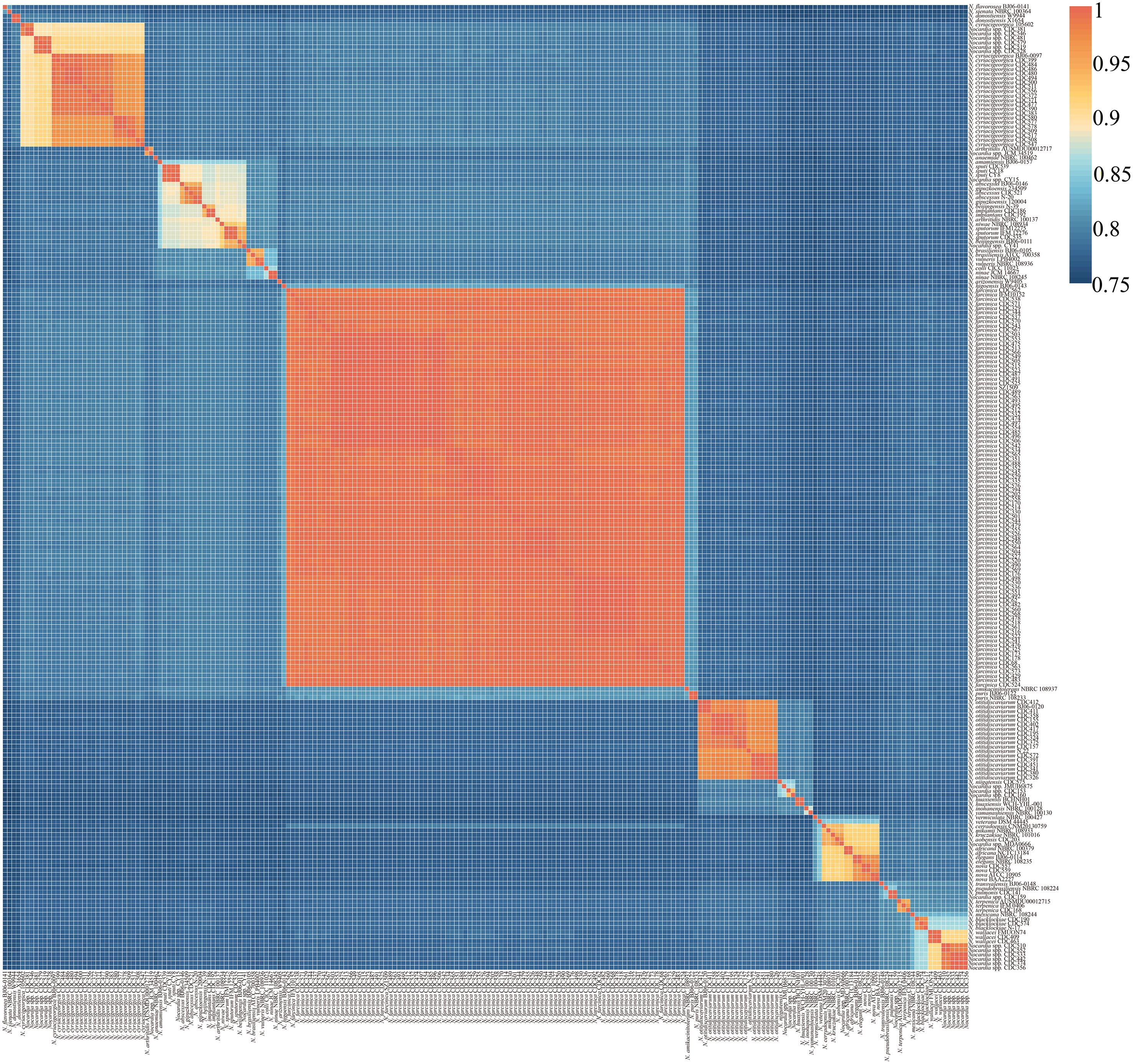 Figure 1. Heatmap of pairwise average nucleotide identity (ANI) values for 218 genome assemblies of Nocardia (148 of this study, 70 of NCBI).