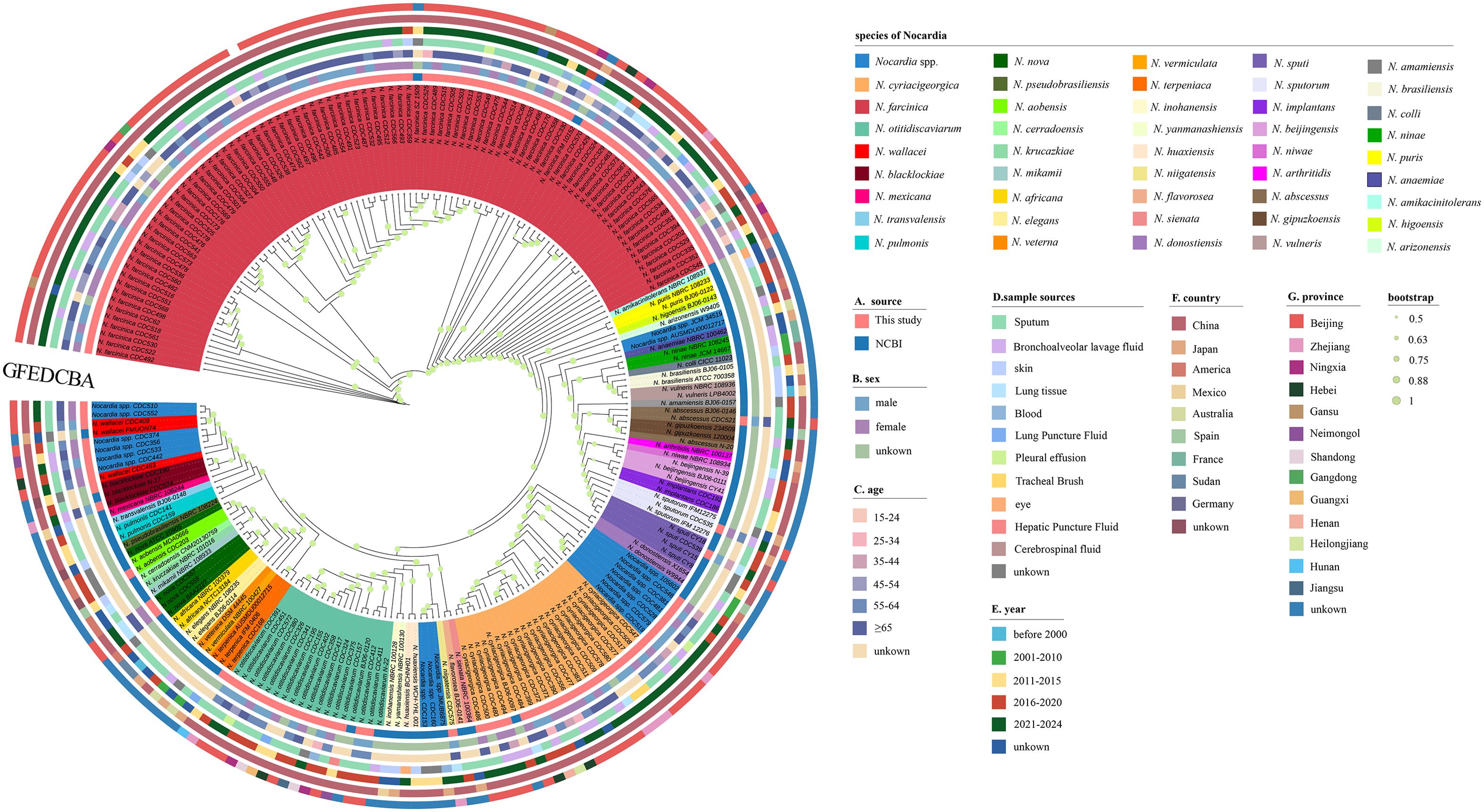 Figure 2. Nocardia genome phylogenetic relationships based on the concatenation of thenucleotide sequences of 668 single-copy core genes. The innermost colored bands represent 46 different species of Nocardia and Nocardia spp. (unable to identify species). (A) A colored ring showing different sources of genomic information of Nocardia. (B) A colored ring showing the gender of patients with Nocardia infections. (C) A colored ring showing the age of patients with Nocardia infections. (D) A colored ring showing sample sources of Nocardia isolates. (E) A colored ring showing five different periods of collection years and the unknown collection years. (F) A colored ring showing different country origins of Nocardia. (G) A colored ring showing different province origins of Nocardia.