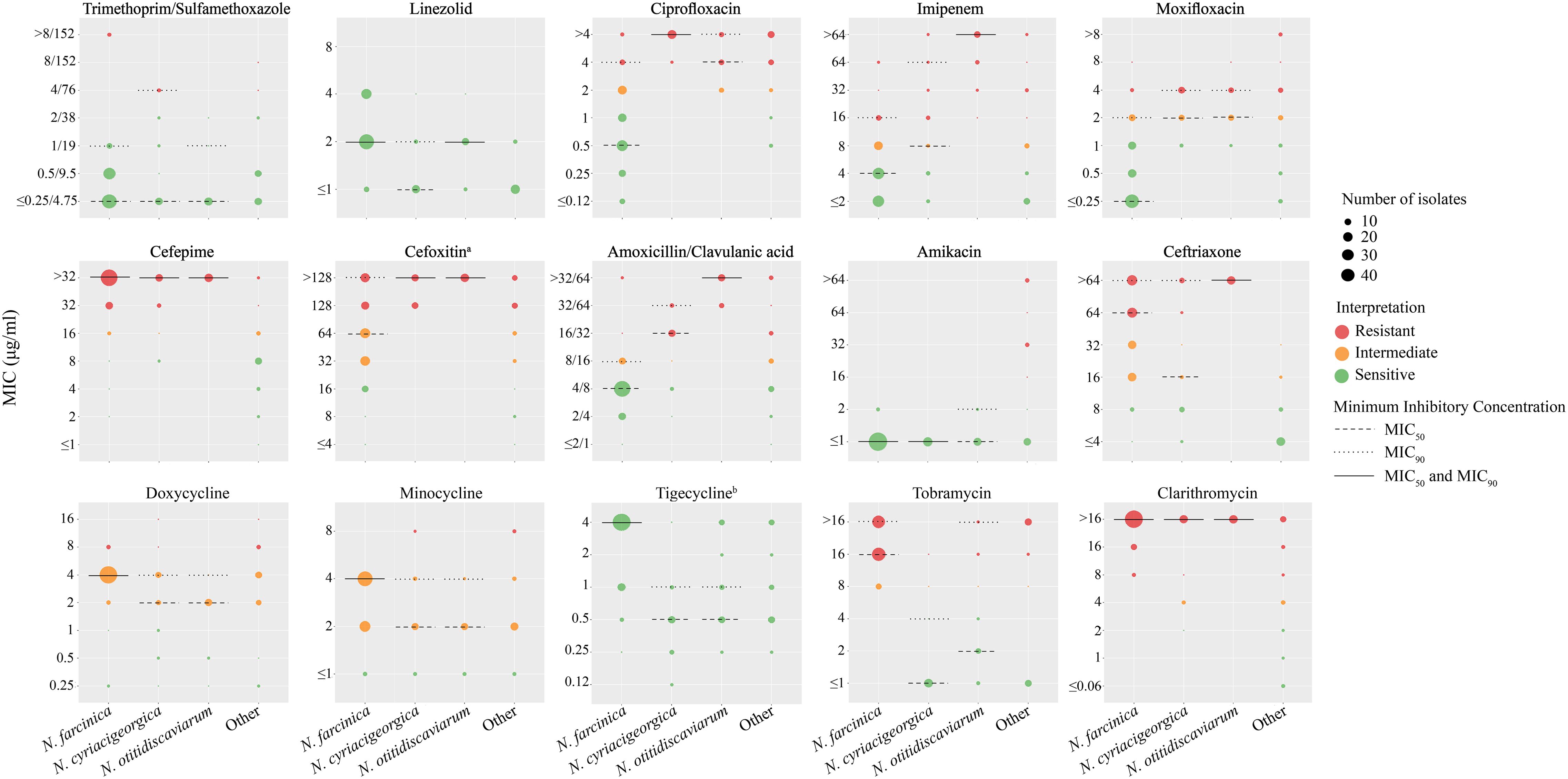Figure 3. The MIC Minimum Inhibitory Concentrations (MICs) of 15 antimicrobials for Nocardia species. The red, orange and green dots indicate the resistant, intermediate and susceptible breakpoints. The size of the points represents the corresponding number of strains. The dashed line represents MIC50, the dotted line represents MIC90, and the solid black line indicates where MIC50 and MIC90 coincide. a:The breakpoint for cefotaxime is referenced from the breakpoint for rapidly growing mycobacteria in CLSI-M24-A2. b: The clinical breakpoint for tigecycline is not provided in CLSI M24-A2.