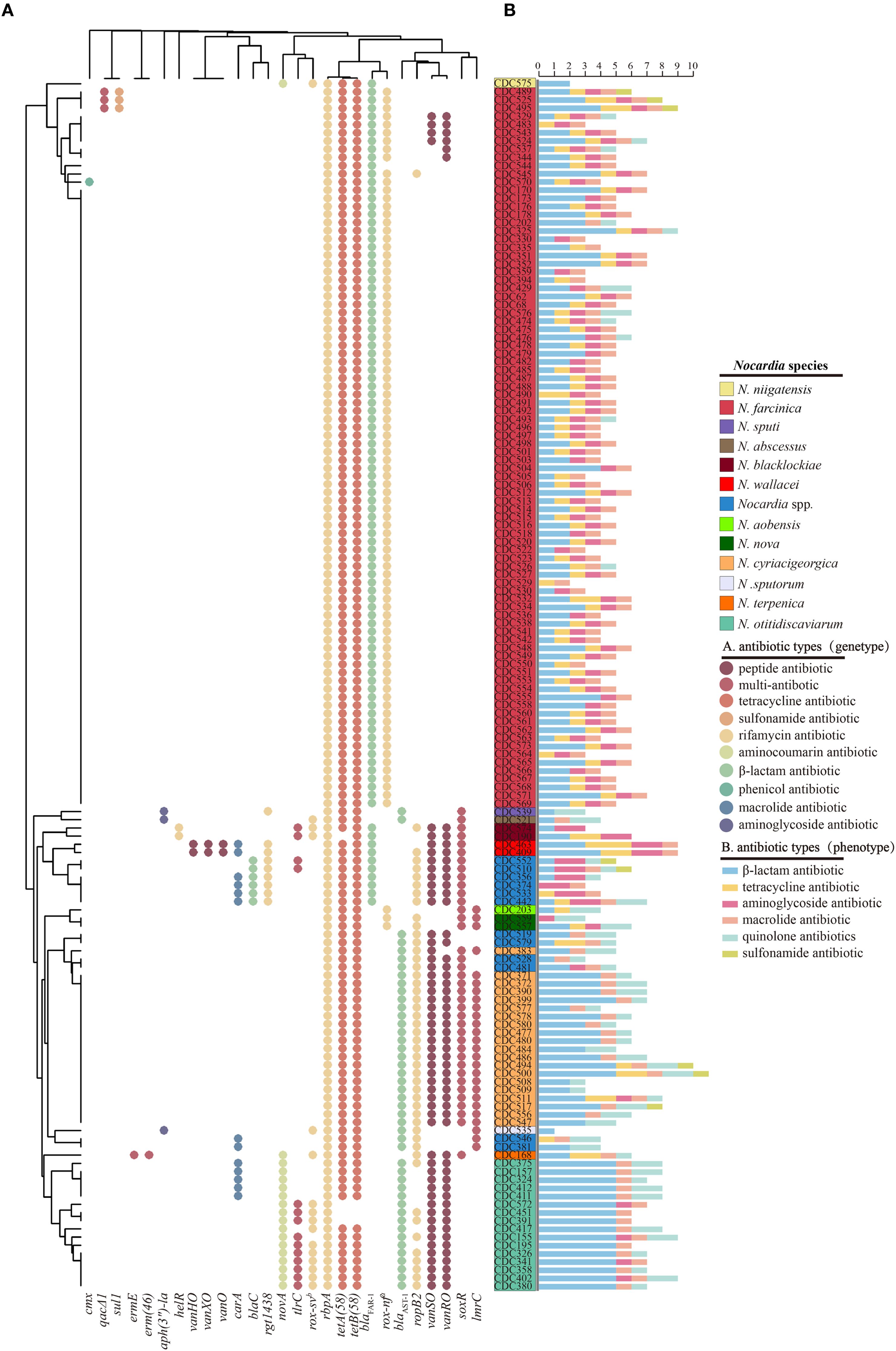 Figure 4. Distribution of Antibiotics Resistance Genes (ARGs) in the genomes of 148 multiple Nocardia strains. Each dot indicates the presence of a gene. Different colors indicate different types of ARGs. rox-nf a: Nocardia farcinica rox; rox-sv b: Streptomyces venezuelae rox (A). Number of antibiotic-resistant phenotypes exhibited by Nocardia spp. across six antimicrobial categories (B).