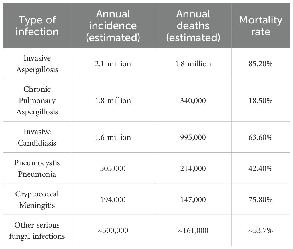 The global burden of fungal infections is substantial, with millions of cases reported annually (Denning, 2024; Iliev et al., 2024). Recent estimates indicate that invasive fungal infections result in an annual incidence of 65 million invasive fungal infections and 3.8 million deaths (Denning, 2024) (Table 1). On October 25, 2022, WHO released its first fungal priority pathogen list, ranking 19 invasive fungi as critical, high, or medium priority based on incidence, mortality, resistance, and therapeutic options (Burki, 2023). The incidence of cryptococcal meningitis in HIV-positive individuals remains alarmingly high, with an estimated 223,000 cases and 181,000 deaths annually (Rajasingham et al., 2017). Additionally, the rise in antifungal resistance complicates treatment paradigms, with studies showing that an increasing number of Candida albicans isolates are resistant to commonly used antifungal drugs (Fisher et al., 2022; Sobel, 2023). These data underscore the urgent need for improved diagnostic, preventive, and therapeutic strategies to address the growing threat of fungal infections globally.