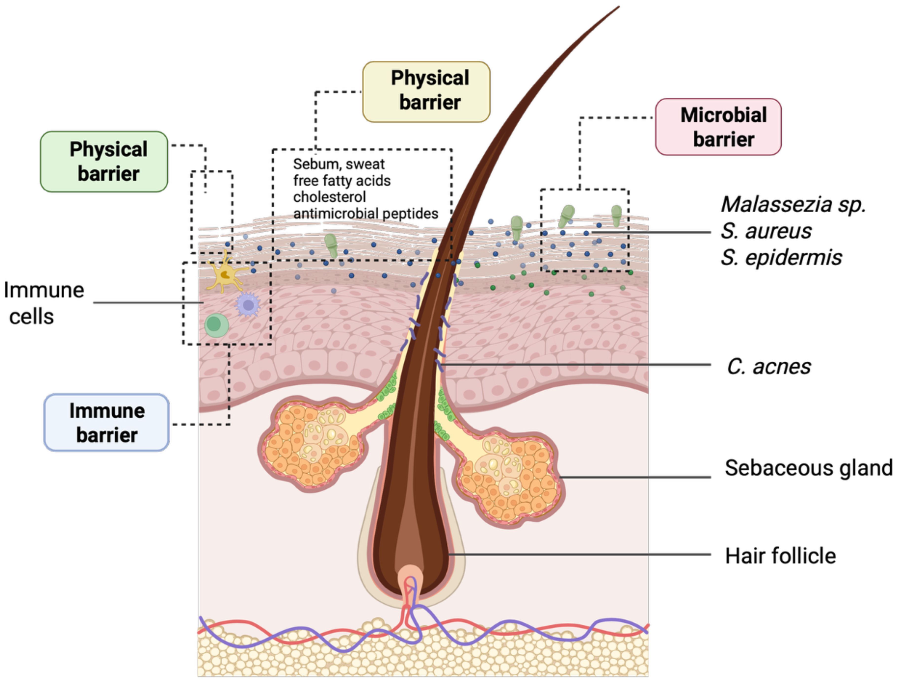 The human skin functions as a multilayered defense system, comprising four interconnected barriers: physical, chemical, immune, and microbial (Nicolaou and Kendall, 2024) (Figure 1). The components operate synergistically to maintain skin homeostasis and prevent the onset of infections, inflammation, and even skin cancers. However, disruptions in any of these systems can compromise the integrity of the others, resulting in skin disease states (Byrd et al., 2018).