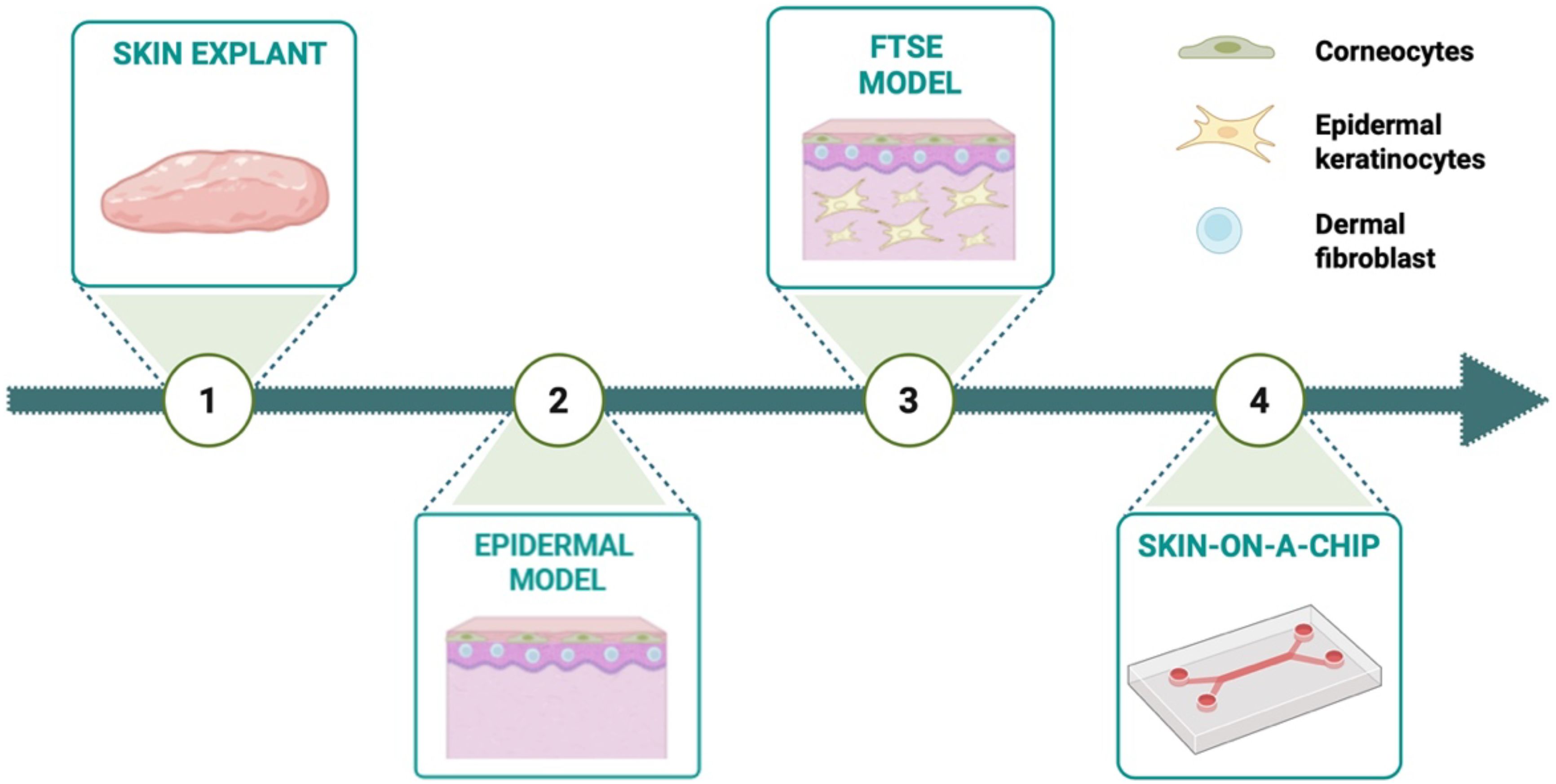Figure 5. Evolution of 3D in vitro skin model from skin explants to skin-on-a-chip systems. The Figure was created in Biorender.