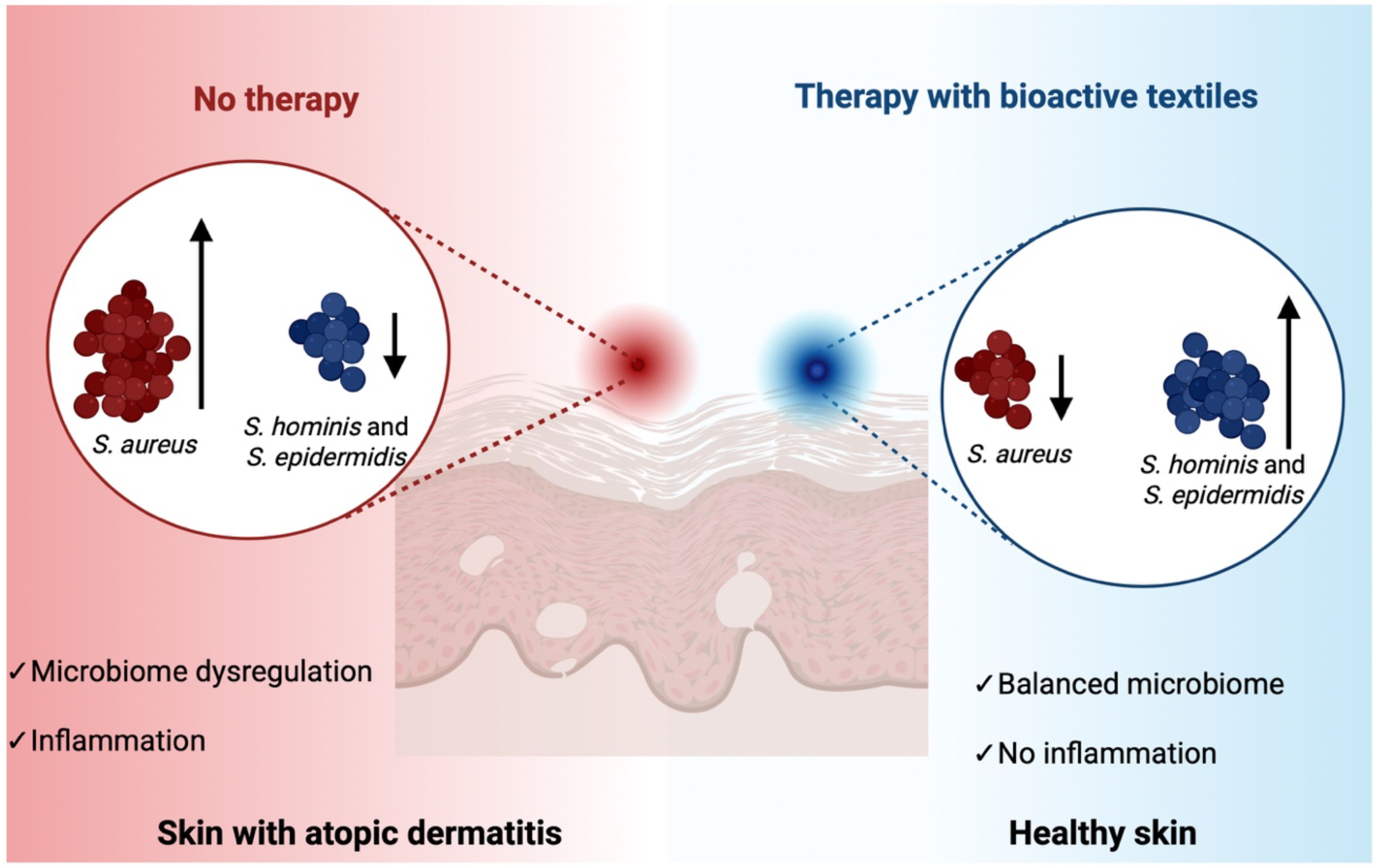 The human skin microbiome is a critical determinant of skin health, acting as a dynamic interface between the body and the external environment. This complex ecosystem of bacteria, fungi, and viruses is essential for maintaining barrier function, modulating immune responses, and resisting pathogen colonization. Disruptions in this microbial equilibrium, often termed dysbiosis, are implicated in a wide range of dermatological disorders including acne, atopic dermatitis (AD), psoriasis, and chronic wounds (Byrd et al., 2018; Carmona-Cruz et al., 2022). In this context, bioactive textiles have emerged as a promising therapeutic approach for restoring microbial balance while simultaneously addressing rising concerns about antibiotic resistance and environmental sustainability (Suellen Ferro de Oliveira and Kekhasharu Tavaria, 2023).