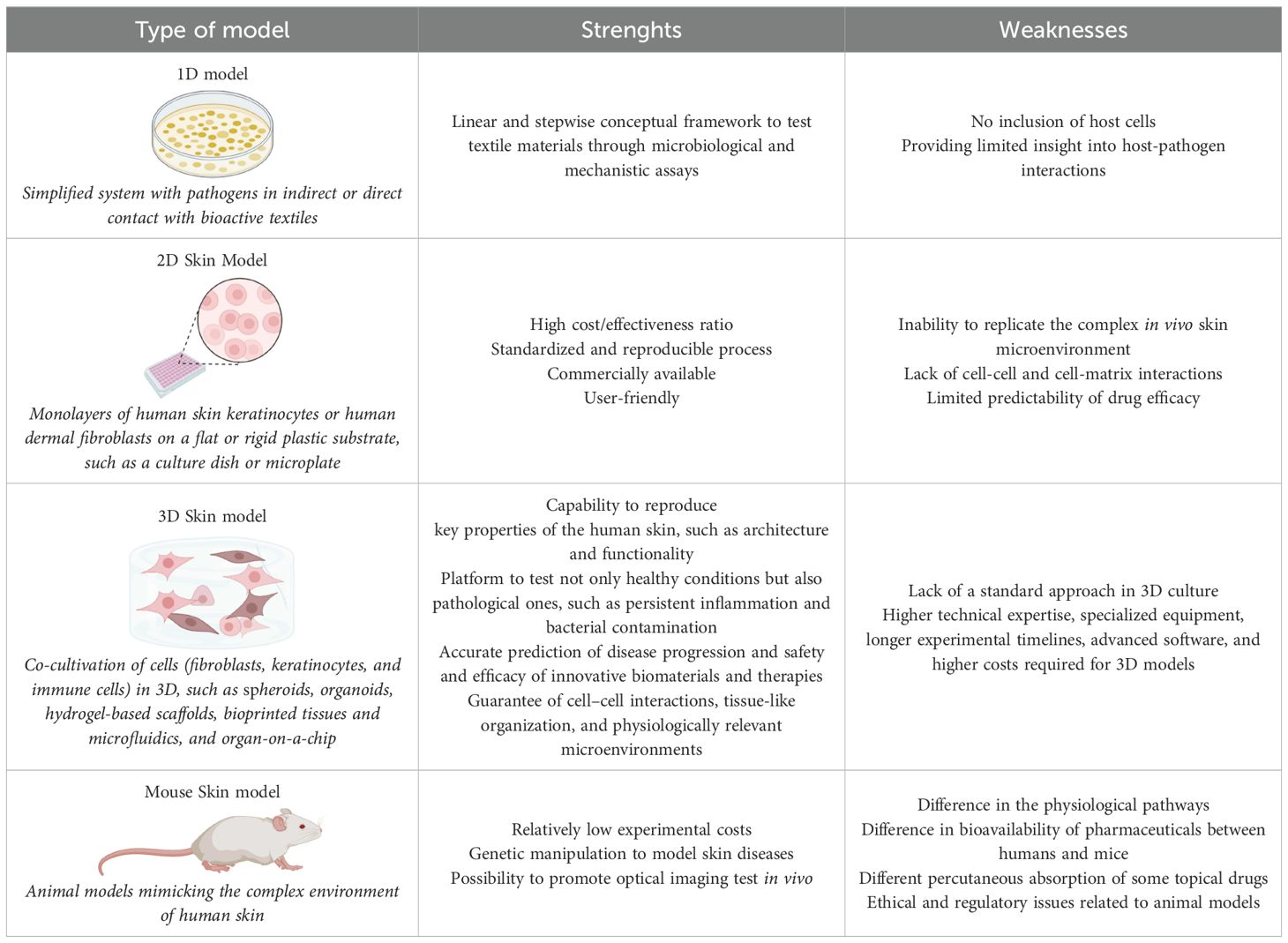 Figure 4. Schematic representation of the progression of in vitro models used to evaluate antimicrobial strategies of bioactive textile materials. The models evolve in complexity from left to right using 1D antimicrobial screening (simplified systems with pathogens in indirect or direct contact with bioactive textiles). Main limitation: These models do not include host cells, providing limited insight into host–pathogen interactions. 2D cell culture: Involves monolayers of keratinocytes and/or fibroblasts grown on flat surfaces. These models enable initial screening of host responses but lack the structural and cellular complexity of skin. 3D cell culture: Incorporates 3D organization of cells, such as fibroblasts and keratinocytes, in monocultures or co-cultures. These models better mimic the skin’s architecture and can include immune cells for enhanced relevance. Advanced 3D culture: Represents the most physiologically relevant in vitro skin models. These systems support the co-culture of keratinocytes, fibroblasts, and immune cells in a 3D matrix and can be challenged with skin-relevant pathogens (e.g., bacteria or fungi). They allow detailed study of host–microbe interactions and antimicrobial efficacy under near-physiological conditions. The image was created in https://BioRender.com.