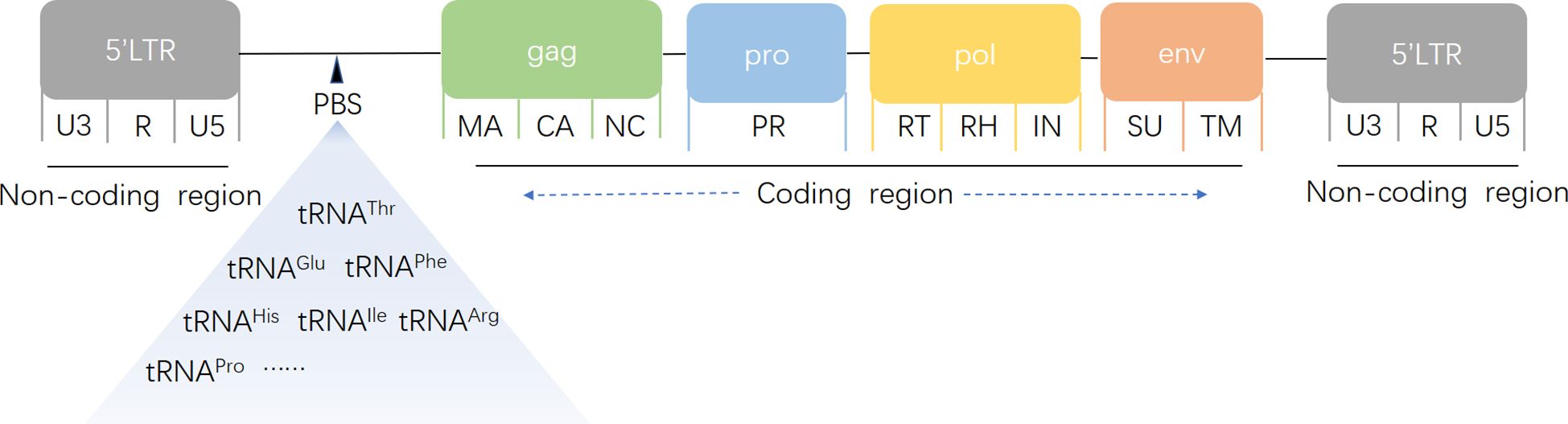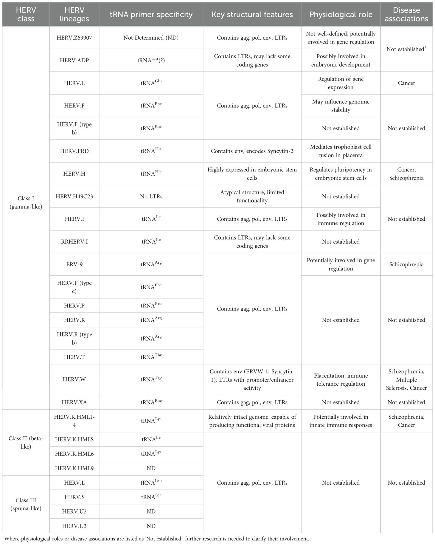 On the basis of their sequence characteristics, HERVs are classified into three major groups: gamma-like, beta-like, and spuma-like retroviruses (Tristem, 2003). HERV nomenclature typically reflects the tRNA specificity of their primer-binding sites and LTR structure (Heidmann et al., 2018). For example, HERV-W uses a tryptophan-specific tRNA primer, HERV-H uses a histidine-specific tRNA, and HERV-K uses a lysine-specific tRNA (Dolei, 2006). Table 1 summarizes the classification, tRNA primer specificity, and key features of the 26 HERV lineages.