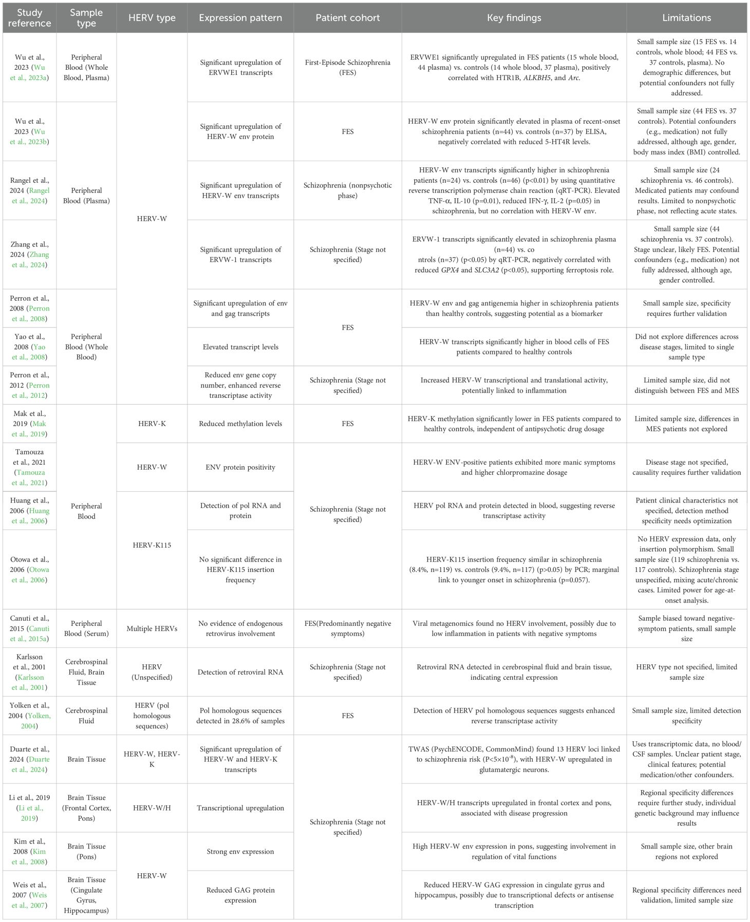 Numerous clinical studies have demonstrated aberrant HERVs expression in the peripheral blood and central nervous system (CNS) of individuals with schizophrenia (Table 2). In peripheral blood, HERV-W env and gag transcripts and proteins are detectable in both healthy controls and first-episode schizophrenia (FES) patients, with significantly higher levels in patients (Perron et al., 2008; Rangel et al., 2024; Wu et al., 2023a, b; Yao et al., 2008; Zhang et al., 2024). One study reported HERV-W env homologous mRNA sequences in the plasma of 42 out of 118 recent-onset individuals with schizophrenia, but not in controls. This discrepancy may be due to differences in sample type (plasma vs. whole blood) and target sequence (cloned vs. canonical HERV-W env transcripts). Plasma-free HERV RNA may reflect recent viral activity, while cellular transcripts are more stable and detectable (Rangel et al., 2024). A reduced HERV-W env gene copy number (Perron et al., 2012) and detection of reverse transcriptase activity(W. Huang et al., 2011, 2006) further suggest enhanced HERV transcriptional and translational activity in individuals with schizophrenia.