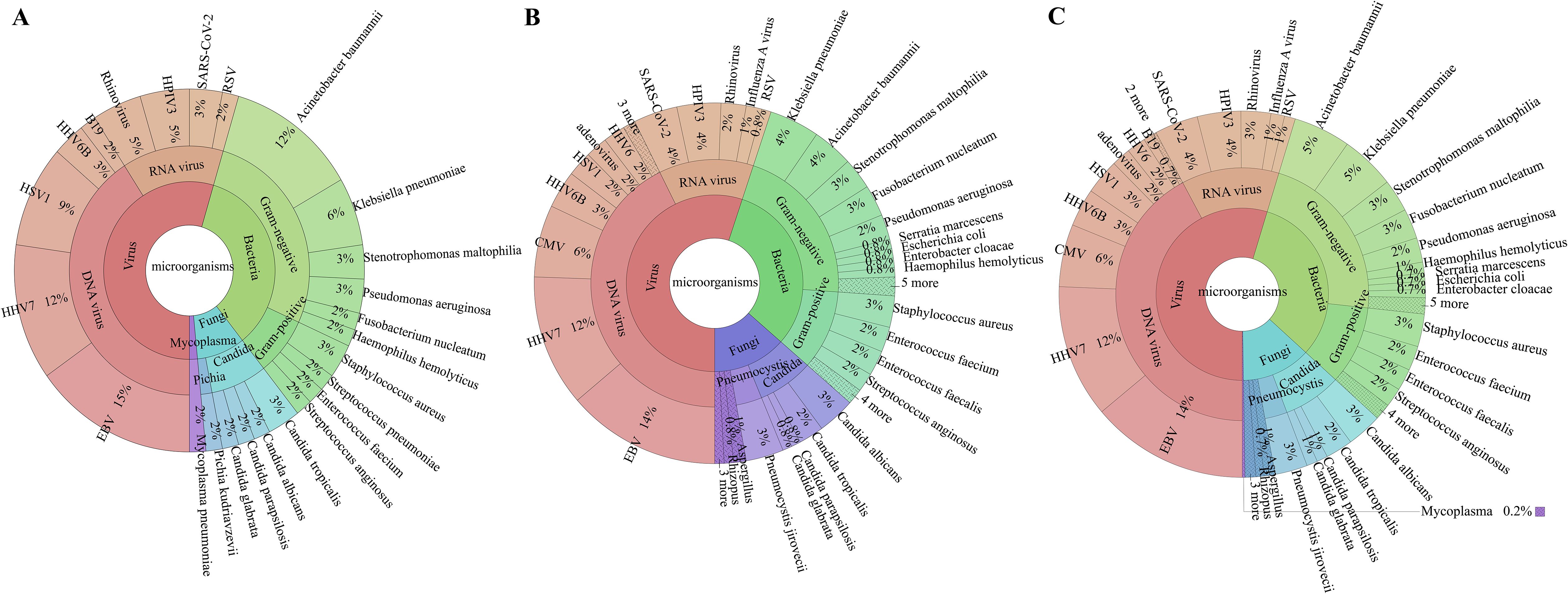 Figure 1. Specific pathogen map. In (A) (Group I: upper respiratory tract), the colour green indicates the detection of bacteria, red signifies the identification of viruses, cyan denotes fungi detection, and purple represents the identification of mycoplasma pneumoniae. In (B) (Group II: lower respiratory tract), the colour green indicates the detection of bacteria, red signifies the identification of viruses, and purple represents the identification of fungi. “3 more, 4 more, 5 more” in B represents more than three types microorganisms with low detection rate. In (C) (combined respiratory sample), the colour green indicates the detection of bacteria, red signifies the identification of viruses, and purple represents the identification of fungi. “3 more, 4 more, 5 more” in B represents more than three types microorganisms with low detection rate. HSV1, herpes simplex virus-1; HHV6B, human herpesvirus 6B; B19, human parvovirus B19; HPIV3, human parainfluenza virus 3; RSV, respiratory syncytial virus; EBV, Epstein–Barr virus; HHV7, human herpesvirus 7; CMV, cytomegalovirus; HHV6, human herpesvirus 6.