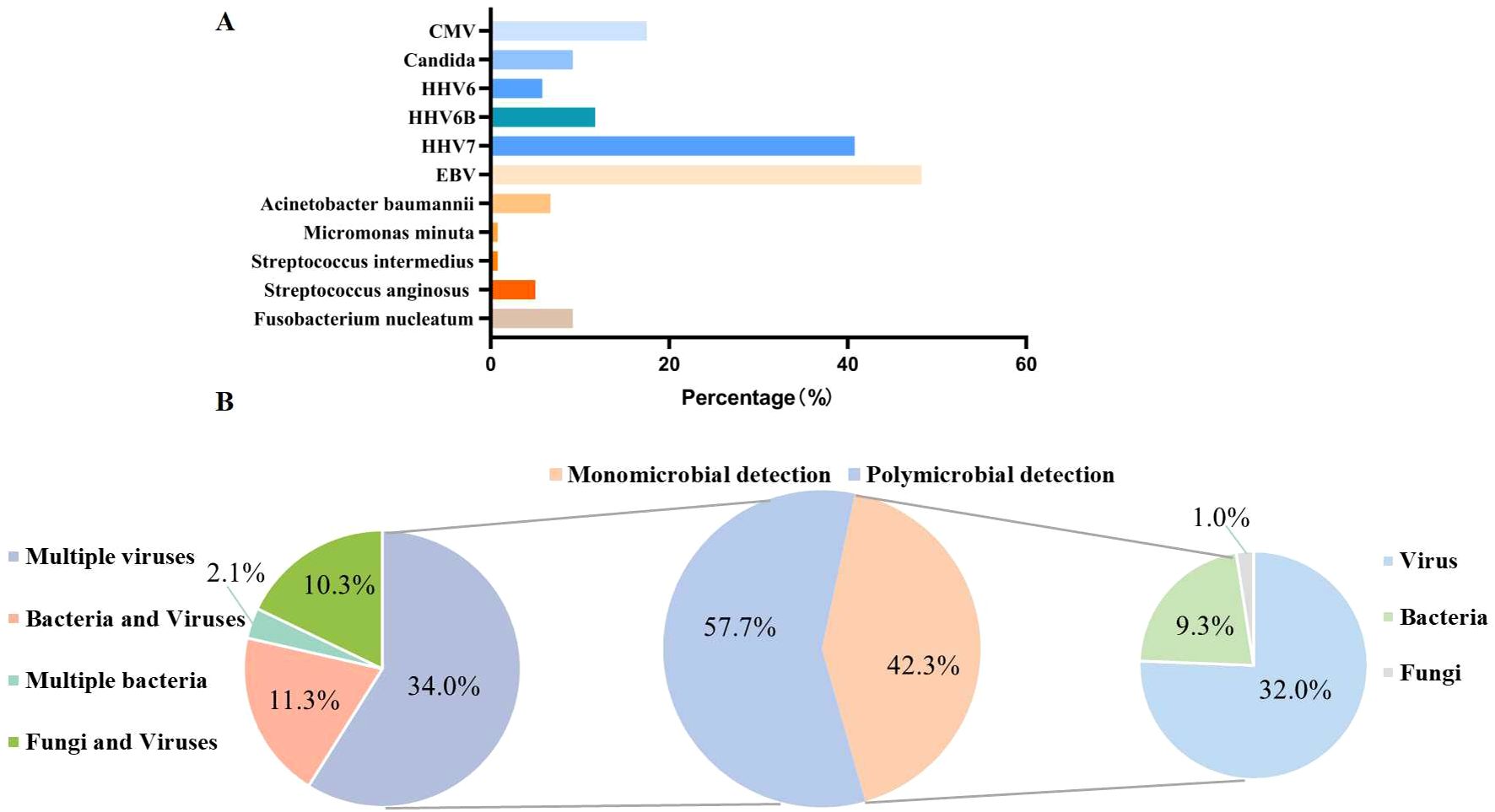 Figure 2. Colonization of microorganisms detected via tNGS across all samples. (A) The specific colonizing microorganisms detected. (B) The distribution of the identified colonizing pathogens. CMV, Cytomegalovirus; HHV6, Human herpesvirus 6; HHV6B, Human herpesvirus 6B; HHV7, Human herpesvirus 7; EBV, Epstein–Barr virus.