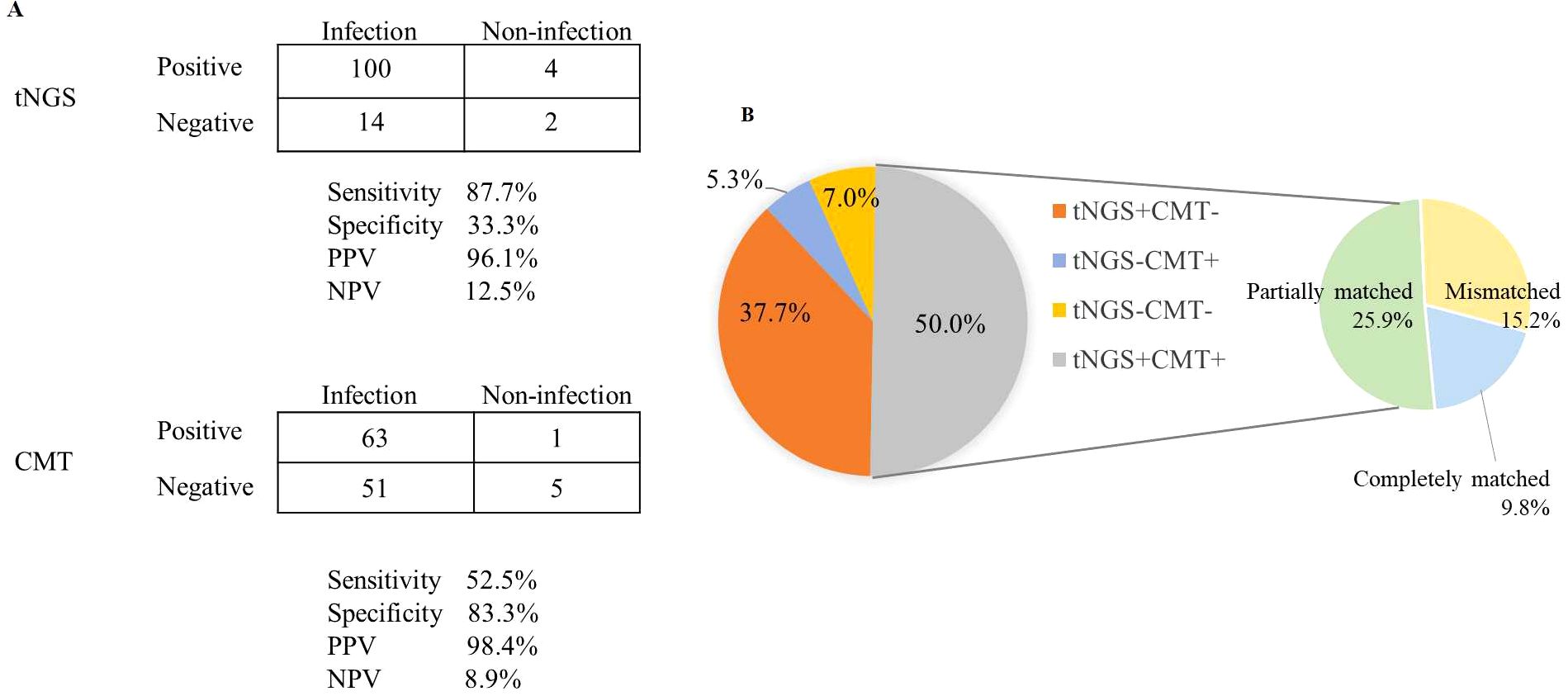 Figure 3. Diagnostic comparison of microorganisms detected via tNGS and CMT. (A) A contingency table presented in a 2 × 2 format illustrating the respective diagnostic performance of tNGS and CMT in differentiating infections. (B) The consistency of positive results for tNGS and CMT across all samples.
