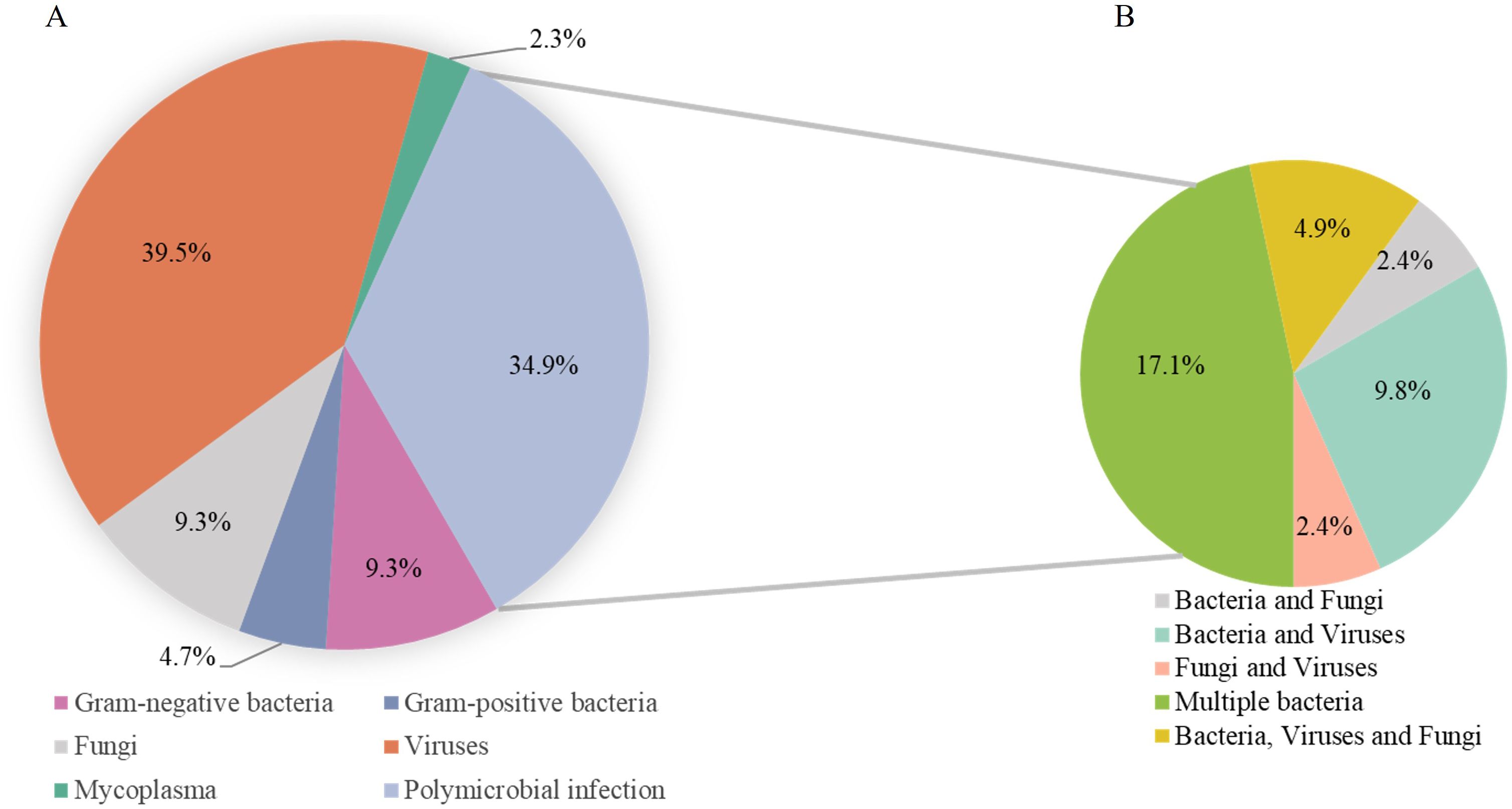 Figure 4. Infection verification by tNGS in CMT-negative patients. (A) Pathogens identified through tNGS in cases that tested negative for CMT. (B) Detection of multiple pathogen structural patterns via tNGS.