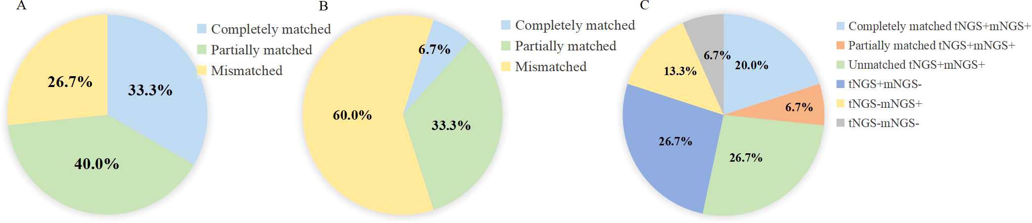 We finally assessed the concordance between respiratory tNGS and respiratory mNGS results. For these cases, the results were completely consistent in 26.7% (4/15) of cases (both positive: 20%, both negative: 6.7%), partially consistent in 6.7% (1/15), and unmatched in 66.7% (10/15) cases (Figure 5c).