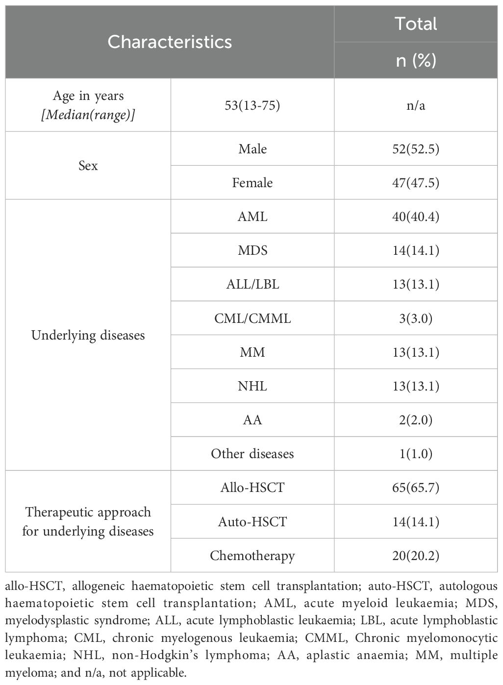 We performed 142 tNGS tests on 100 patients between November 2022 and May 2023. Of these, three tests were conducted for pathogen screening prior to therapy, five tests were repeated from the same samples within 7 days, and eight tests were follow-up tests after anti-infection therapy. Consequently, 126 tests from 99 patients, with 120 clinical events, were included in the data analysis (Supplementary Figure S1). Sixty-four patients (65.7%) underwent allo-HSCT (Table 1). The tNGS test samples were divided into two groups: Upper respiratory tract (oropharyngeal swab, group I, 23 cases) and lower respiratory tract[group II, 103 cases, sputum (n=91) and bronchoalveolar lavage fluid(BALF, n=12)]. The most common source of mNGS specimens was peripheral blood (26 cases), followed by BALF (16 cases), pleural effusion (1 case) and sputum (1 case).