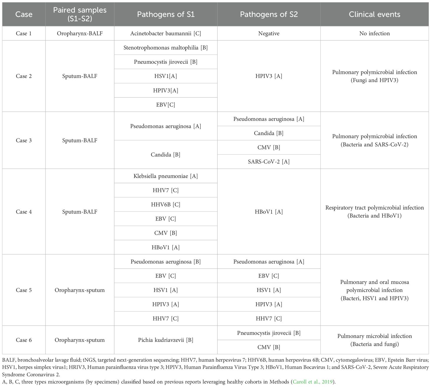 We conducted paired tNGS tests, defined as tNGS performed on different specimens for the same clinical event, on six pairs. We found that the tNGS results from different specimens, based on the final classification criteria, were mostly consistent, with a concordance rate of 83.3% (Table 2).