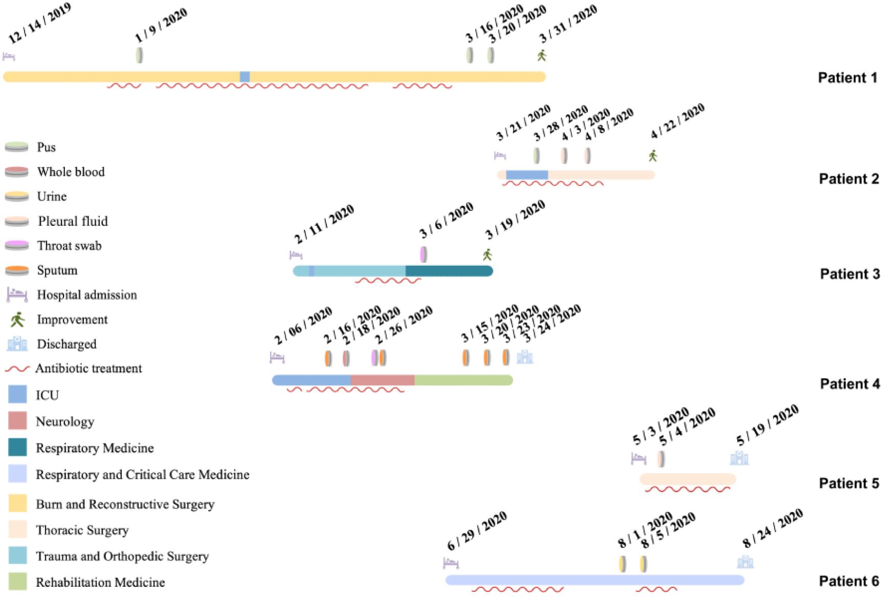 Figure 1. Epidemiological overview of the six patients included in this study. Each horizontal bar represents the hospitalization timeline of one patient(the timeline for Patient 6 is displayed separately), with different colors indicating different hospital wards. Red wavy lines denote periods of antibiotic treatment. Admission and discharge dates, as well as the dates of pathogen isolation (with colors indicating different specimen types), are marked numerically on the timeline. Different symbols at the end of each timeline indicate the discharge outcome of each patient.