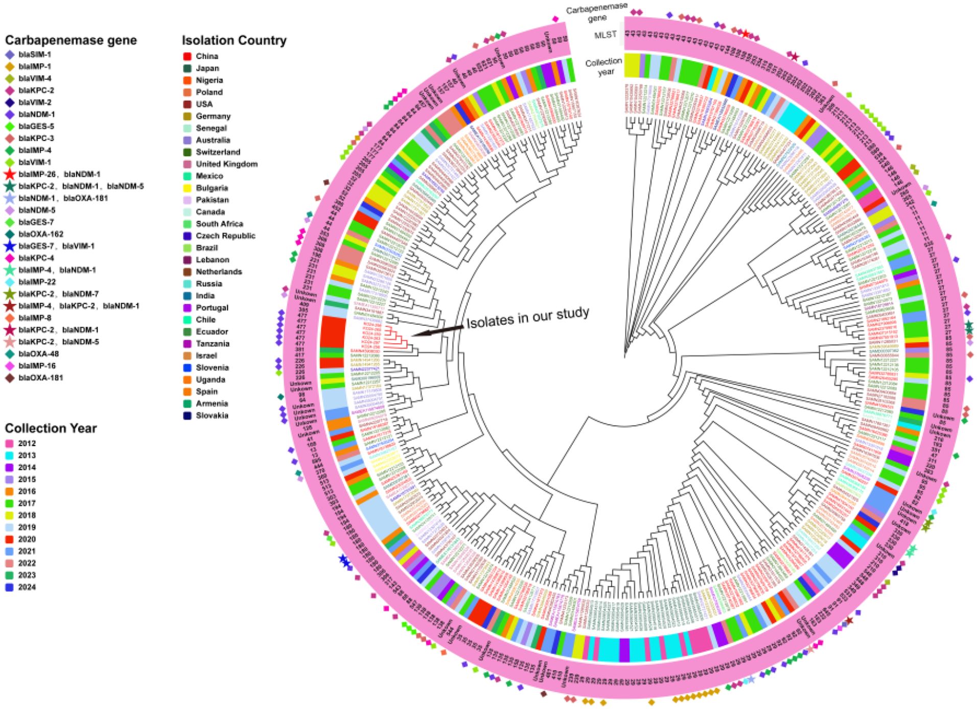 Figure 3. Phylogenetic tree of 344 K. michiganensis genomes retrieved from the PATRIC and six ST477 K. michiganensis clinical isolates from this study. Starting from the outermost circle, carbapenem resistance genes are represented using distinct symbols and color combinations. The second circle shows the MLST of each strain in text format. The third circle indicates the collection year of the strains using different color bars. The inner circle uses different colors to represent the countries from which the strains were isolated.