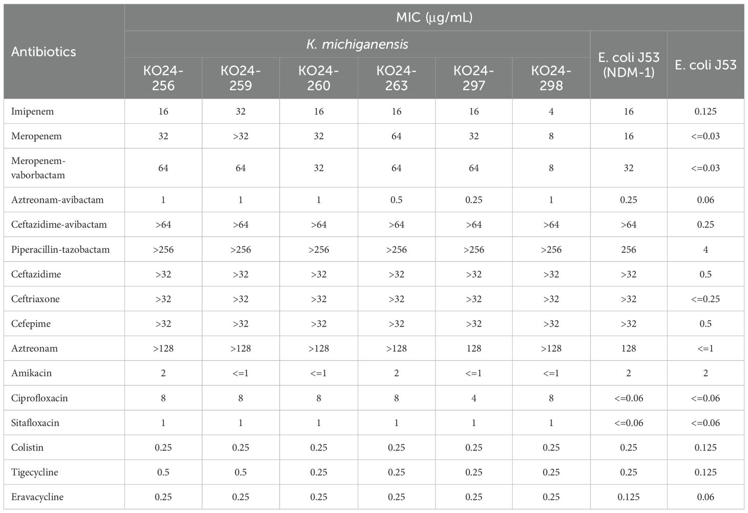 Between 14 December 2019 and 23 August 2020, six non-duplicate pathogenic strains were isolated from clinical specimens of six hospitalized patients at Jilin Provincial People’s Hospital (only the first isolate per patient was included).Initial identification by matrix-assisted laser desorption/ionization time-of-flight mass spectrometry (MALDI-TOF MS) indicated that all isolates belonged to the Klebsiella oxytoca complex. Specifically, strains KO24–256 and KO24–259 were isolated from pus, KO24–260 from a throat swab, KO24–263 from whole blood, KO24–297 from pleural fluid, and KO24–298 from urine. Final species identification by whole-genome sequencing confirmed all isolates as K. michiganensis. Polymerase chain reaction (PCR) was performed to screen for carbapenemase genes, including blaKPC, blaNDM, blaIMP, blaOXA-48, and blaVIM. Quality control strains for antimicrobial susceptibility testing included Escherichia coli ATCC 25922 and Pseudomonas aeruginosa ATCC 27853.