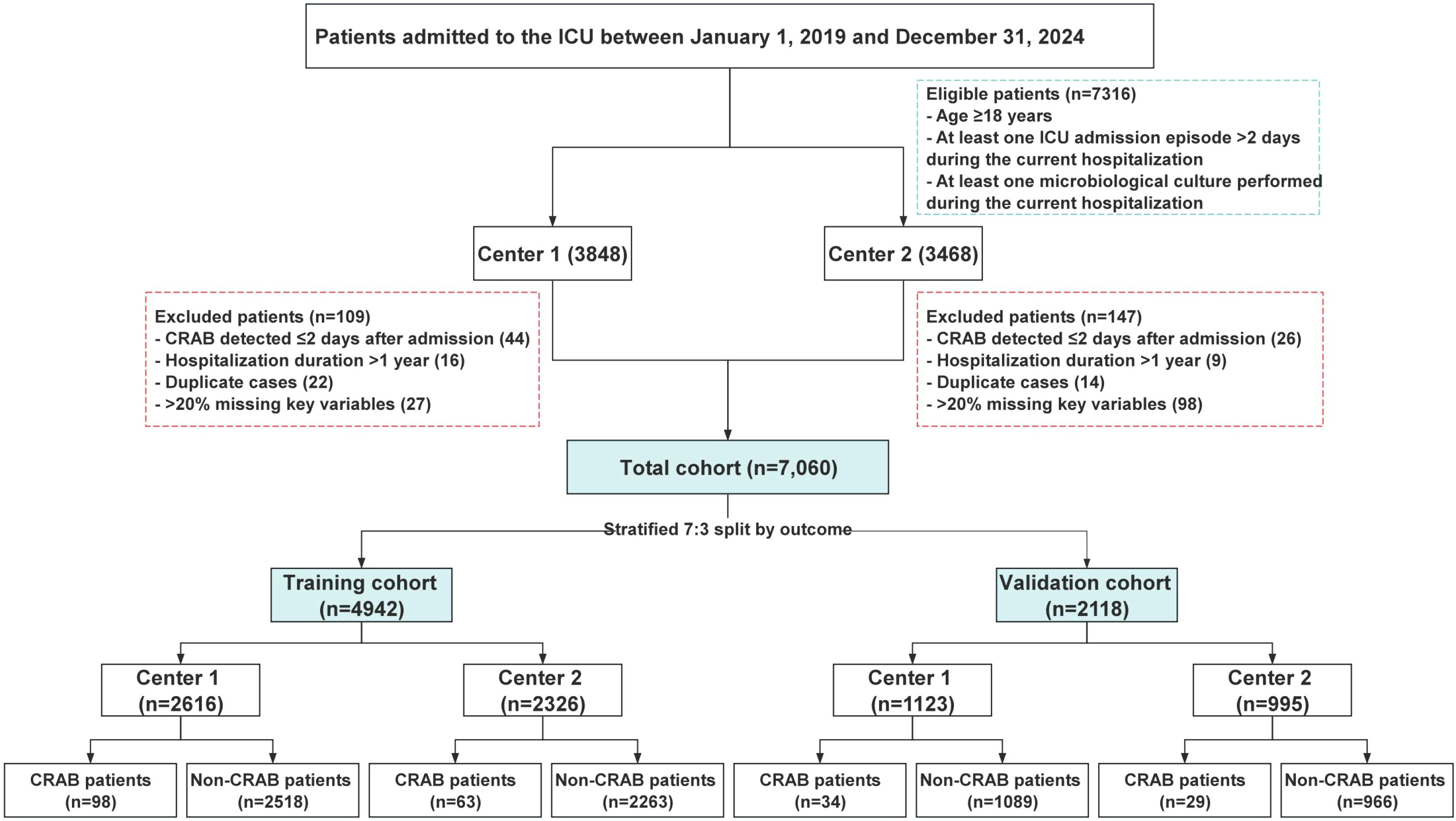 All adult patients (aged ≥18 years) admitted to the ICU during the study period were screened. Inclusion criteria were: (1) ICU length of stay > 2 calendar days and (2) at least one microbiological culture performed during hospitalization. The >2-day ICU stay criterion was applied to ensure a sufficient observation window for the assessment of exposure variables and the occurrence of hospital-acquired events, aligning with standard surveillance definitions for healthcare-associated infections (CDC, 2025b). The requirement for at least one microbiological culture was essential to ascertain the CRAB status (the outcome) for all included patients, which is a fundamental prerequisite for constructing the prediction model. Exclusion criteria included: (1) CRAB detection within the first two calendar days of admission (suggesting community-acquired or pre-existing infection); (2) hospital stay >365 days; (3) readmission within 2 days after discharge; or (4) missing >20% of key variables. After applying these criteria, a total of 7,060 eligible ICU patients were included. The cohort was randomly divided into a training set (n = 4,942) and a validation set (n = 2,118) using a 7:3 ratio, stratified by the outcome. A detailed flowchart of participant inclusion and exclusion is presented in Figure 1.