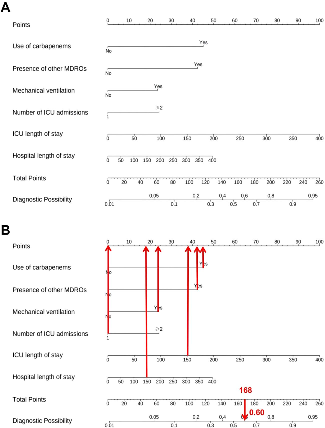 Illustration with two panels, A and B, showing a point scoring system for diagnostic possibility involving several factors. Panel A displays criteria without values: use of carbapenems, presence of other multidrug-resistant organisms (MDROs), mechanical ventilation, number of ICU admissions, ICU and hospital length of stay. Panel B adds numerical scores with red arrows and labels indicating points and corresponding diagnostic possibilities: total points of 168 and a diagnostic possibility of 0.60.