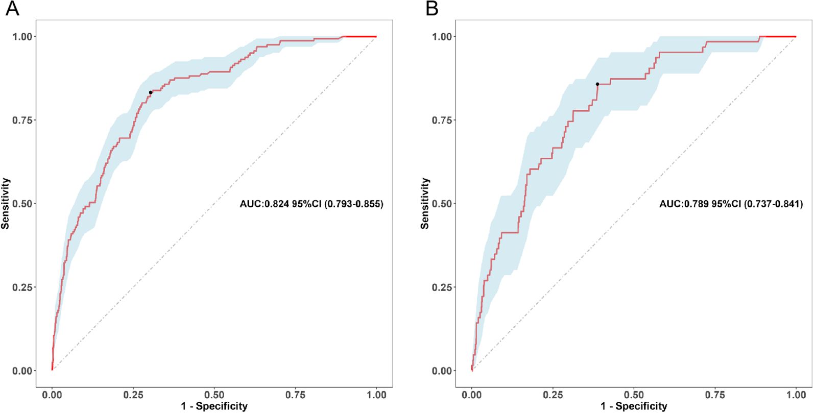 Two ROC curves labeled A and B compare sensitivity versus 1-specificity. Curve A shows an AUC of 0.824 with a 95% confidence interval of 0.793-0.855. Curve B shows an AUC of 0.789 with a 95% confidence interval of 0.737-0.841. Both curves have a red line with a blue shaded confidence band, indicating predictive performance.