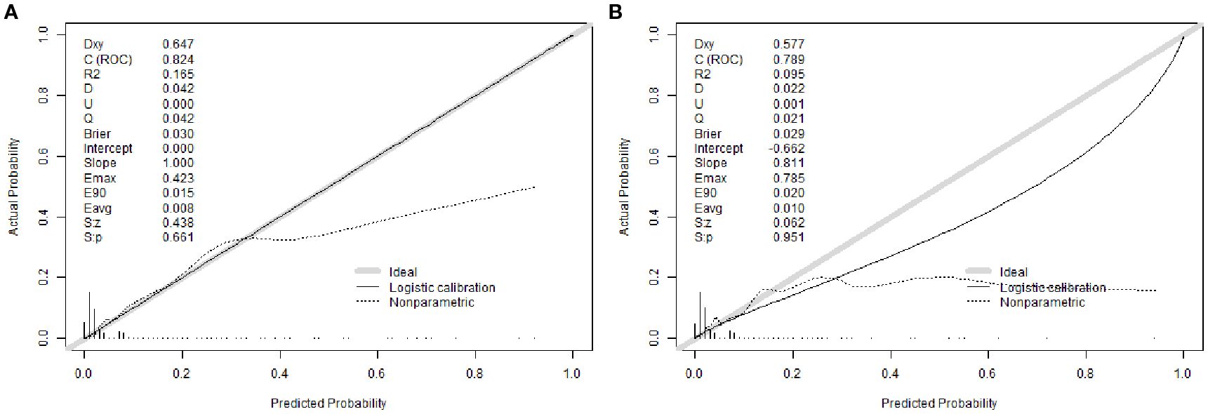 Side-by-side calibration plots labeled A and B. Both plots show actual probability on the y-axis versus predicted probability on the x-axis. Each plot includes an ideal line, a logistic calibration line, and a nonparametric line. Statistics like Dxy, C (ROC), R2, D, and Brier are listed with corresponding values. Plot A shows ideal and logistic fits closely aligned, while B deviates more, especially in logistic calibration.