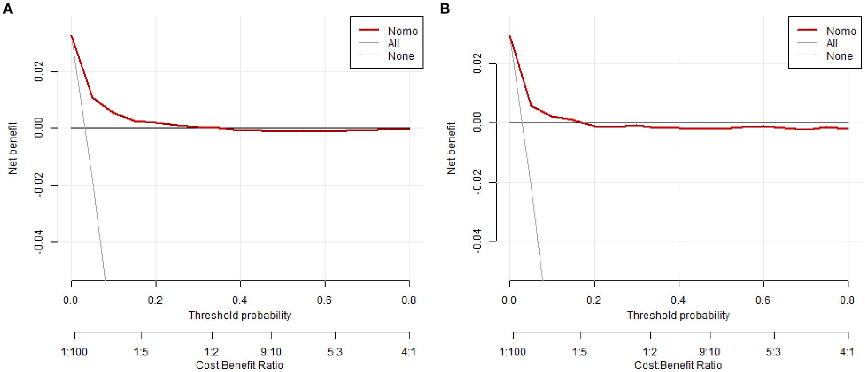 Two decision curves labeled A and B analyze net benefit against threshold probability and cost-benefit ratio. Both graphs show three lines representing “Nomo” (red), “All” (gray), and “None” (black). The “Nomo” line peaks and stabilizes, while “All” decreases sharply, and “None” remains flat near zero.