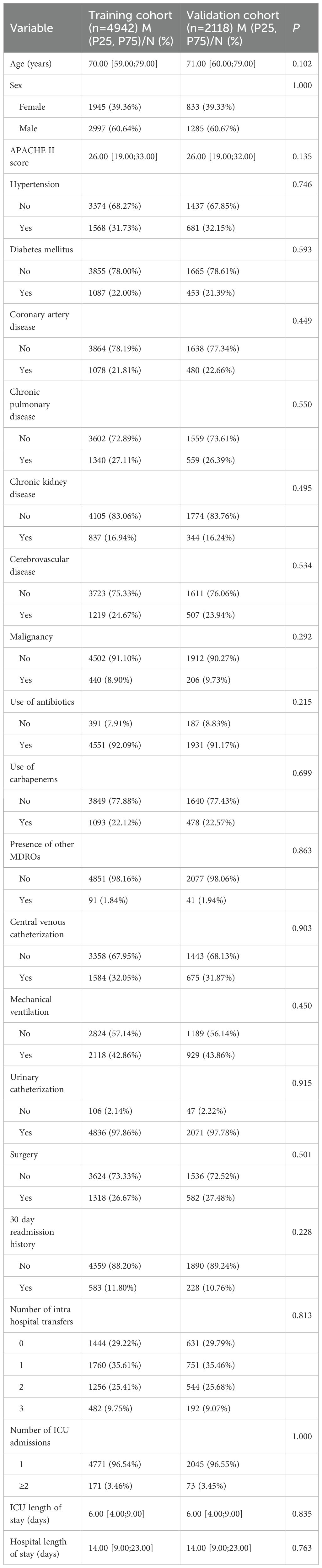 The baseline characteristics of patients in the training and validation cohorts are presented in Table 1. The two cohorts were well-balanced across all assessed variables, including age, sex, APACHE II score, comorbidities, antibiotic exposure, invasive procedures, and hospital course indicators. No statistically significant differences were observed, confirming the comparability of the cohorts for model development and validation.