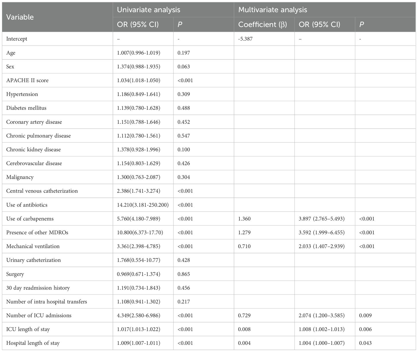 Univariate logistic regression analysis was performed in the training cohort to identify potential predictors of hospital-acquired CRAB colonization or infection. Variables with a P value < 0.05 were considered candidates for multivariate analysis. These included the APACHE II score, use of any antibiotics, carbapenem exposure, presence of other MDROs, central venous catheterization, mechanical ventilation, number of ICU admissions, ICU length of stay, and hospital length of stay (Table 2).