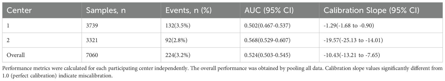 Nonetheless, several limitations warrant consideration. First, and most critically, the retrospective design limits our ability to establish a fixed, prospective prediction timepoint and introduces potential for residual confounding. Although exposure variables such as carbapenem use and mechanical ventilation were ascertained prior to CRAB detection, the precise temporal sequence and duration of these exposures remain challenging to delineate. This inherent limitation may inflate the apparent model performance and underscores the need for caution in clinical interpretation. Second, the observed heterogeneity in model performance across centers (AUC range: 0.502–0.568) underscores the challenge of developing universally applicable prediction models in heterogeneous ICU settings and highlights the need for local calibration before clinical implementation.Third, although internal validation demonstrated robustness, external validation across diverse geographic and healthcare contexts is essential to confirm generalizability (Collins et al., 2024). Fourth, the absence of critical infection control variables—such as environmental contamination metrics and healthcare worker hand hygiene adherence—may limit comprehensive capture of all acquisition drivers (Li et al., 2024a; Wei et al., 2024). Fifth, lack of molecular characterization of CRAB isolates restricts insight into clonal dissemination and resistance evolution (Xu et al., 2024). Finally, by design, our model predicts a composite outcome of CRAB acquisition without distinguishing colonization from infection. While this approach is optimal for triggering broad infection prevention measures, it does not directly guide specific therapeutic interventions, which represents a focus for future antimicrobial stewardship models.