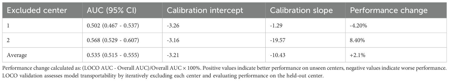 To evaluate model transportability and robustness across clinical settings, we performed two complementary validation strategies: center-wise performance analysis and leave-one-center-out (LOCO) cross-validation. The discriminative performance varied between centers, with AUC values of 0.502 (95% CI: 0.467–0.537) for Center 1 and 0.568 (95% CI: 0.529–0.607) for Center 2 (Table 3). The LOCO validation yielded an average AUC of 0.535 (Table 4), representing a -9.5% relative change from the overall performance. This observed heterogeneity in model performance across centers and the performance decrement in LOCO analysis highlight the challenge of maintaining predictive accuracy when transitioning between healthcare settings with distinct patient populations and clinical protocols. These variations likely reflect differences in local case-mix, clinical practices, and CRAB endemicity levels between the participating institutions.