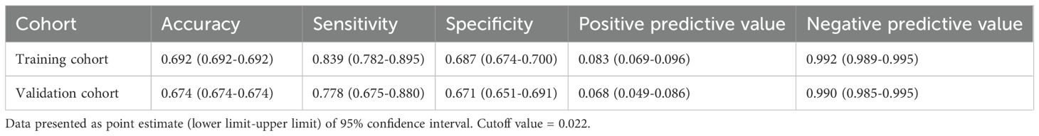 The optimal probability threshold for identifying high-risk individuals was determined to be 0.022, based on the maximum Youden index on the ROC curve (Figure 3A). Individuals with predicted probabilities exceeding this threshold were classified as high-risk for hospital-acquired CRAB. The diagnostic metrics, including accuracy, sensitivity, specificity, positive predictive value, and negative predictive value, are detailed for both the training and validation cohorts in Table 5.