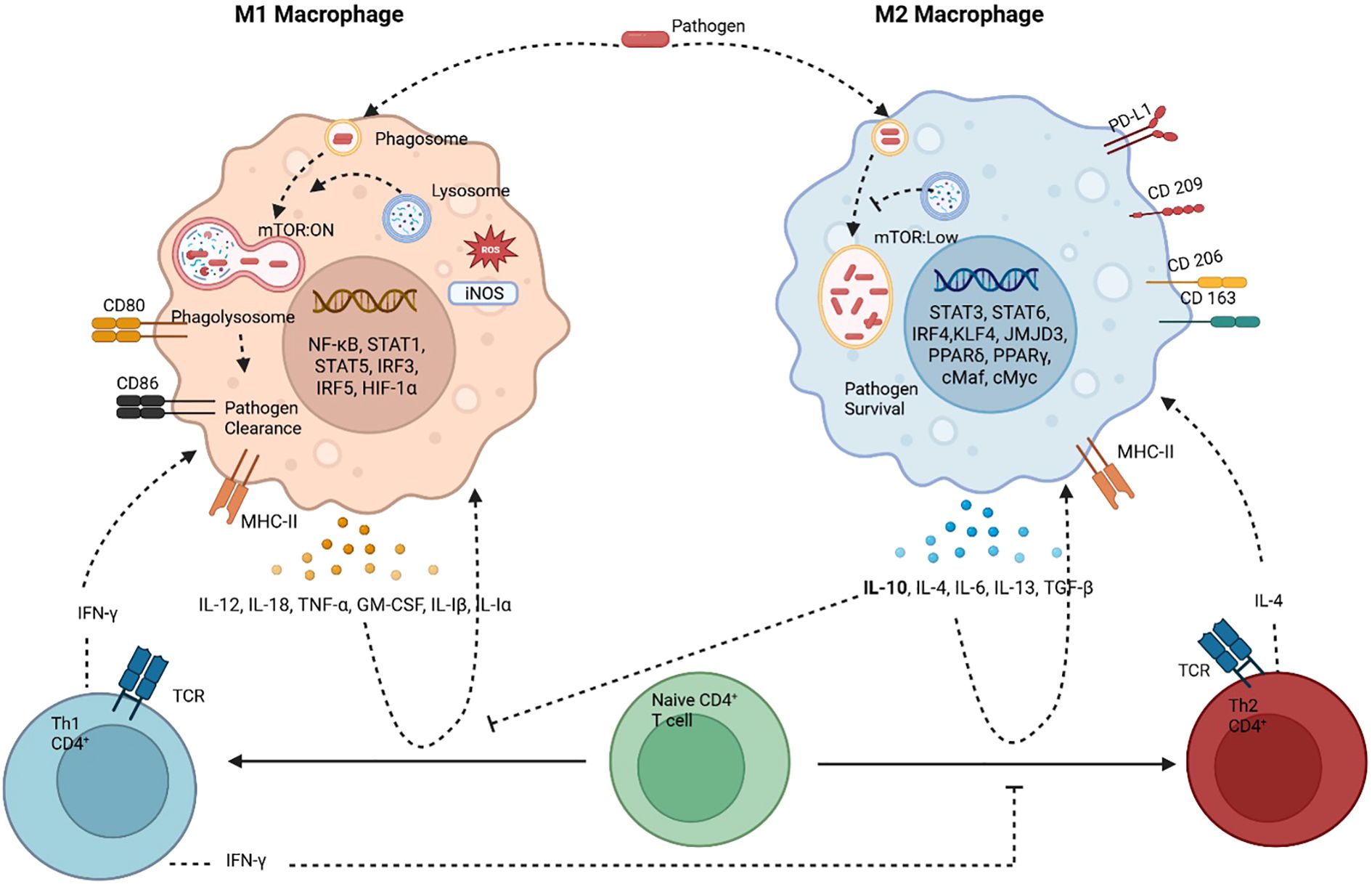 Figure 1. Macrophages and T cells constantly interact with each other through cytokines, antigen presentation, metabolic states and physiological states to determine macrophage polarization and TH1/TH2 skewed T cell response. M1 macrophages (classically activated) have heightened autophagy which aids in pathogen clearance. M1 macrophages are pro-inflammatory, antimicrobial and tumoricidal. The M1 macrophages are associated with TH1 CD4+ T cells, which activate each other by antigen presentation and a crosstalk of cytokines. The other type is the alternatively activated M2 macrophages, this phenotype is associated with autophagy inhibition and pathogen/microbial persistence. It’s anti-inflammatory and associated with tissue repair and is tumor promoting. This phenotype is accompanied by TH2 skewed T cell response. Dominance of one type of response is inhibitory to the other, TH1 cytokine IFN-Υ inhibits TH2 phenotype and TH2 cytokine IL-10 inhibits TH1 phenotype. Created in BioRender. Shoeran, et al. (2025) https://BioRender.com/2in15jf.